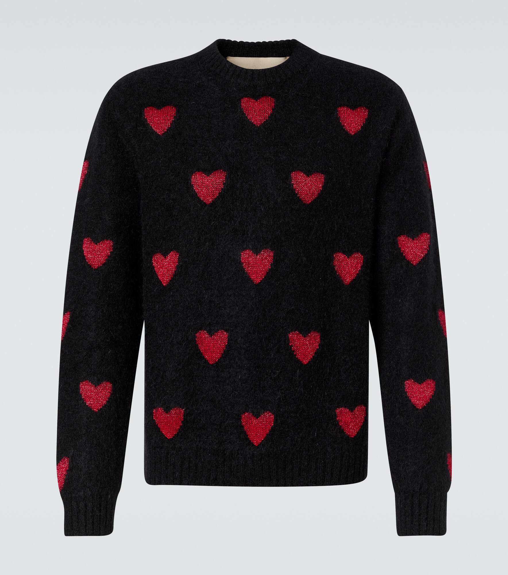 Knitted from wool-blend yarns, this Valentino sweater features a classic crewneck silhouette and is entirely covered in a lame heart jacquard pattern. Product Details - Material: 39% mohair, 36% wool, 22% polyamide, 2% viscose, 1% metallic fibres - Care instructions: dry clean - Made in Italy - Designer color name: Nero Red - Item color: black, red - Collar: crewneck - Sleeves: long-sleeved - Item number: P01043630 Size & Fit - True to size - Straight fit - Stretchy fabric - Falls to the hip - The model in the picture is 185cm-6'1" and wearing a size L