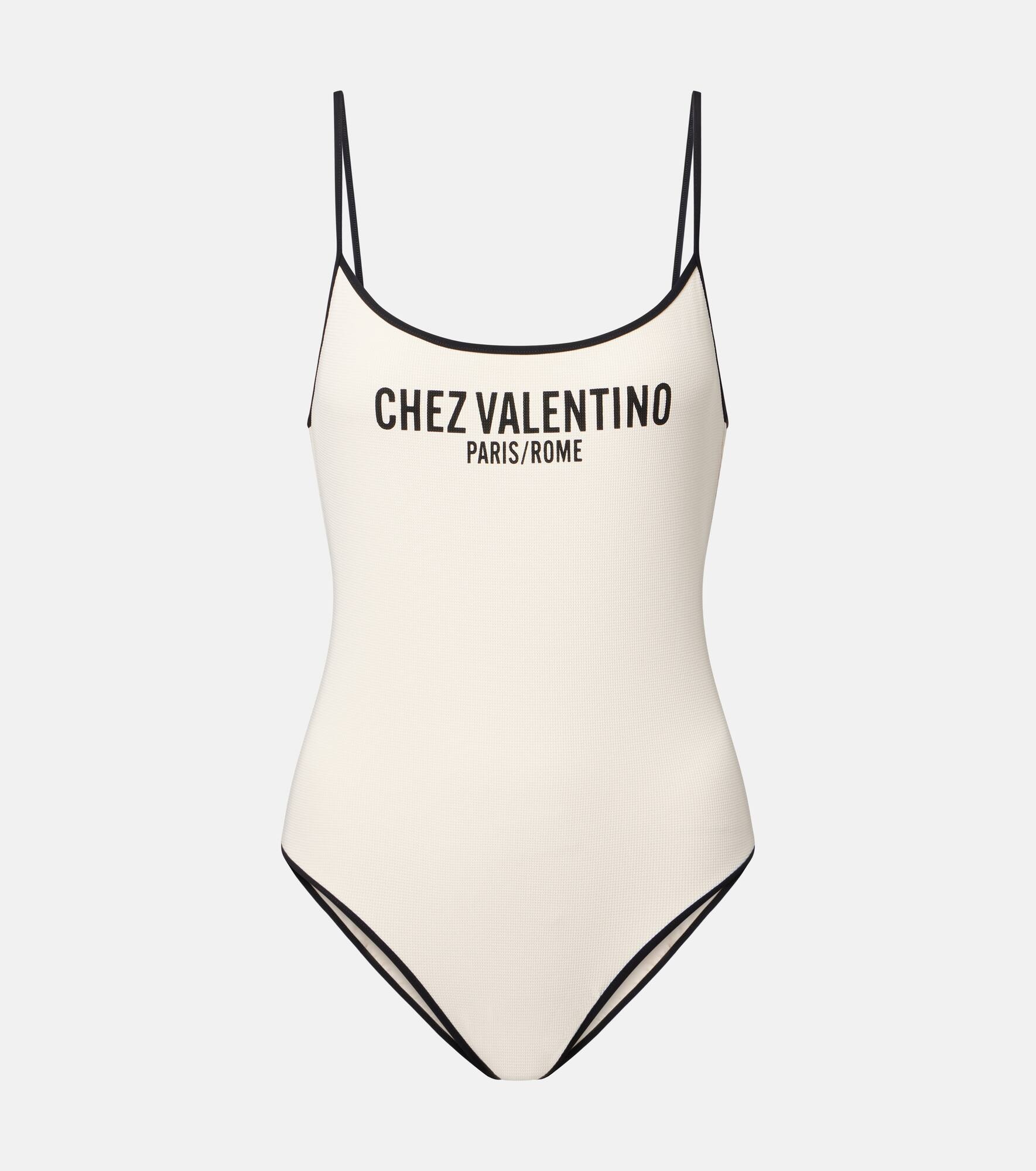 Made from pique fabric, this retro Valentino swimsuit features a minimalist silhouette, contrast trims and shoulder straps, and a Chez Valentino print. Product Details - Material: 87% polyamide, 13% elastane - Care instructions: hand wash - Made in Italy - Designer color name: Betulla/Nero - Item color: beige, black - Lining: 73% polyamide, 27% elastane - Material II: 75% polyamide, 25% elastane - Includes: dust bag - Item number: P01060072 Size & Fit - True to size - Unpadded Top - Medium-cut leg - The model seen in the picture is 178cm-5'10" and wearing a size XS