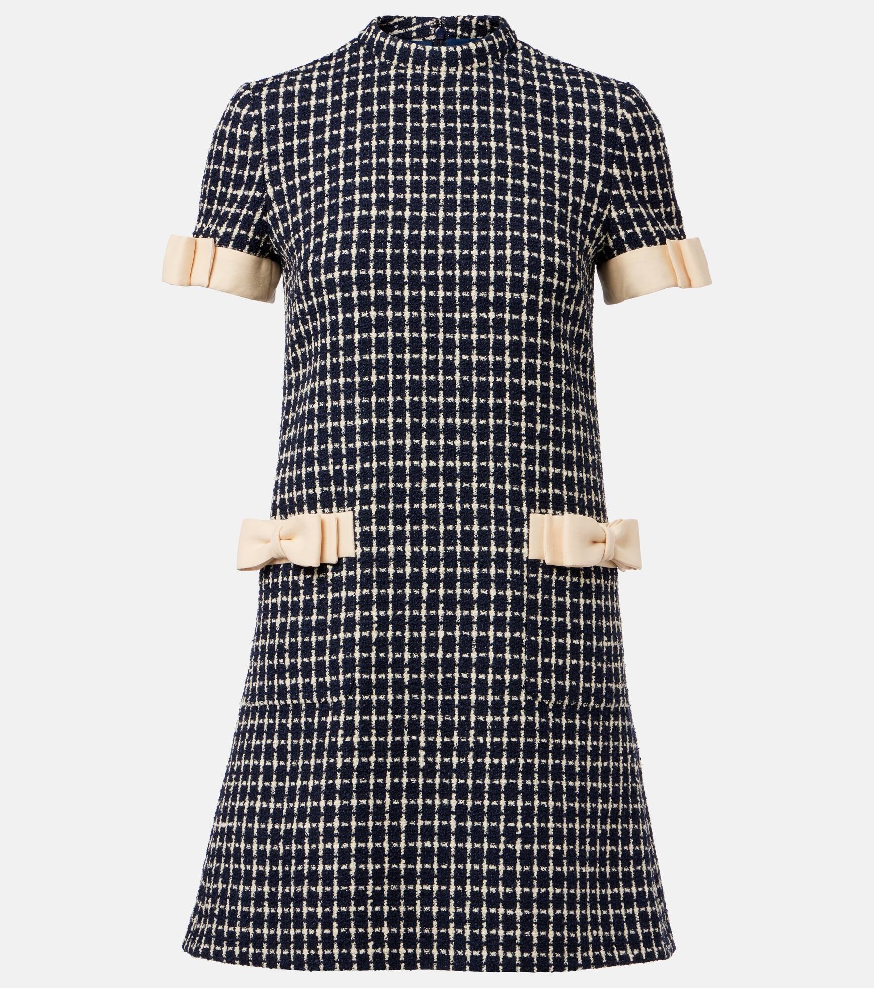 Valentino's signature Mossi pattern provides structure and elegance to this minidress. Made from a luxurious wool and cotton blend, this style is shaped to an A-line silhouette and features delicate bow details at the sleeves and pockets. Product Details - Material: 77% wool, 17% cotton, 6% polyamide - Care instructions: dry clean - Made in Italy - Designer color name: Navy/Avorio - Item color: blue - Item number: P01060182 Size & Fit - True to size - Designed for a loose fit - Non-stretchy fabric - The model seen in the picture is 178cm-5'10" and wearing a size IT 40