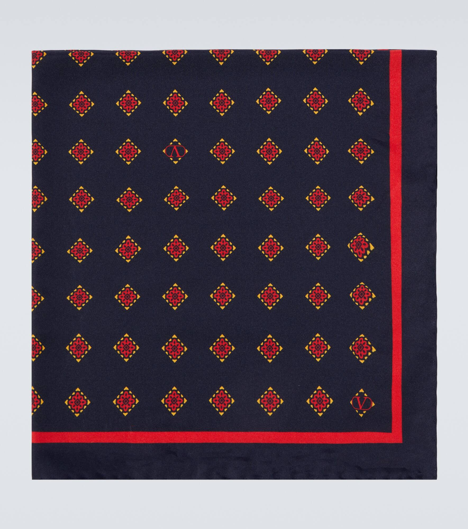 This eye-catching Valentino Garavani scarf is crafted from fine silk and finished with a colorful Opticool print featuring small VLogos throughout. Product Details - Material: 100% silk - Care instructions: dry clean - Made in Italy - Designer color name: Navy/Giallo/Rosso - Item color: blue, red - Item number: P01043640 Size & Fit - Length 60cm-23.5" - Width 60cm-23.5"