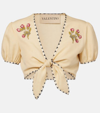 Made in Italy, this crop top has a front bow as fastening and features floral thread embroidery with a Plus De Pois twill border – a precise expression of Valentino’s artisanal craftsmanship and enduring elegance. Product Details - Material: 86% viscose, 14% linen - Care instructions: dry clean - Made in Italy - Designer color name: Betulla/Multicolor - Item color: ivory - Trim: 100% silk - Closure: self-ties - Item number: P01055246 Size & Fit - Fits large to size - we recommend trying one size smaller - Cinched waist - Adjustable at the waist - Non-stretchy fabric - Cropped - The model seen in the picture is 178cm-5'10" and wearing a size IT 38
