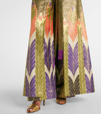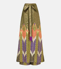 Crafted in Italy from a silk-blend, these wide-leg pants from Valentino showcase a vibrant allover print. This design features an invisible zipper and self-ties for closure. Product Details - Material: 82% silk, 18% metallic fibres - Care instructions: dry clean - Made in Italy - Designer color name: Salvia/Multicolor - Item color: green, multicolor - Lining: 100% silk - Closure: invisible zipper, self-ties - Item number: P01055256 Size & Fit - True to size - Non-stretchy fabric - Wide-leg - High-waisted - Height of model is 180cm-71" and wears a size IT 40
