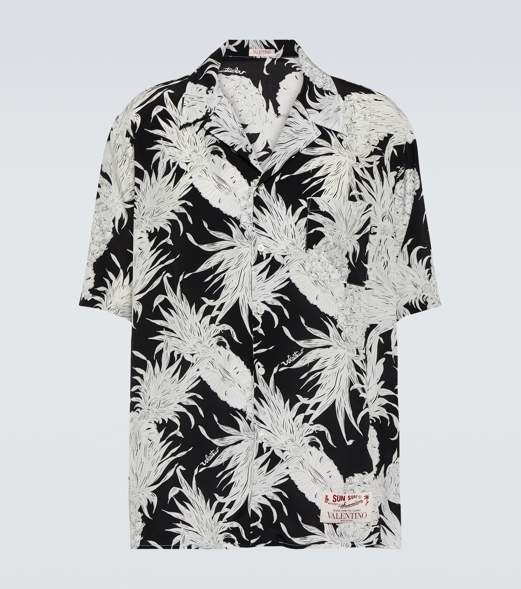 This Valentino bowling shirt is an easy and elegant choice for casual days. Made in Italy from pure silk, this design comes with an all-over print of a monochromatic pineapple motif. Product Details - Made in Italy - Pockets: patch - Material: 100% silk - Closure: buttoned front - Care instructions: dry clean - Contains non-textile parts of animal origin - Item number: P00806245 Size & Fit - True to size - Designed for a loose fit - Lightweight material - Falls below the hip - The model in the picture is 185cm-6'1" and wearing a size IT 48