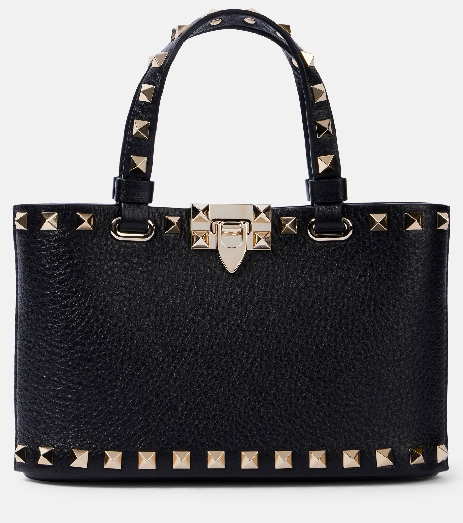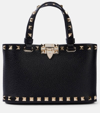 The Rockstud tote bag from Valentino Garavani is crafted from supple leather and features a spacious interior perfect for daily use. The design features top handles and the brand's iconic stud embellishments for a glamorous touch. Product Details - Material: leather - Lining: leather - Made in Italy - Designer color name: Nero - Item color: black - Closure: zipped top - Adjustable top handle - Hardware color: gold - Internal details: card slot - Item number: P01056429 Size & Fit - Height 12cm-4.5" - Width 18,5cm-7.5" - Depth 5cm-2" - Chain length 117cm-46" - Min. length of handles 22cm-8.5"