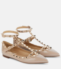 Valentino Garavani’s artisanal approach to footwear is not confined to its way with leather; it shows in the detailing of icons such as the Rockstud design, too. The pyramidal studs are made from brass, and then galvanized to achieve their striking finish. Once hand-applied onto these pink patent leather ballet flats, they radiate the inimitable sophistication the label is coveted for. - upper: calf leather - lining: leather - trim: platinum-plated studs - sole: leather insole and sole - pointed toe - buckle-fastening ankle strap - Made in Italy - Designer colour name: Poudre