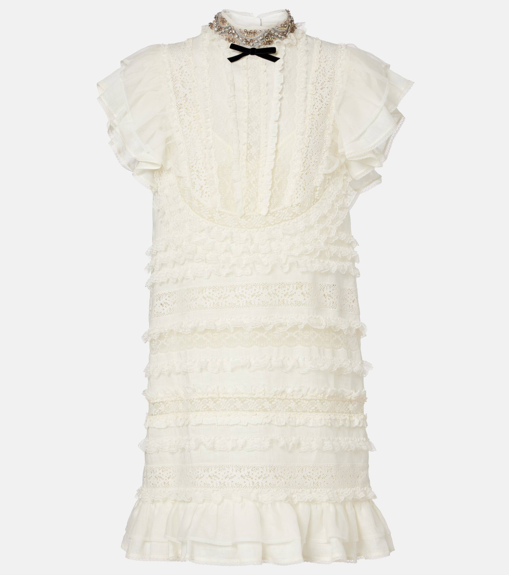 This lace and linen minidress by Valentino exudes timeless romance, featuring a delicate bow at the embellished mock neck for an exquisite contrast. Ruffled accents and tiered sleeves add graceful movement to the silhouette. Product Details - Material: 100% linen - Care instructions: dry clean - Made in Italy - Designer color name: Avorio - Item color: white - Lining: 100% cotton - Material II: 100% polyamide - Embroidery: 100% polyester - Lace: 100% polyamide - Insert: 90% cotton, 10% polyamide - Trim: 100% silk - Closure: buttoned back - Item number: P01060197 Size & Fit - True to size - For a closer fit, we recommend taking one size down - Designed for a loose fit - Non-stretchy fabric - The model seen in the picture is 178cm-5'10" and wearing a size IT 40