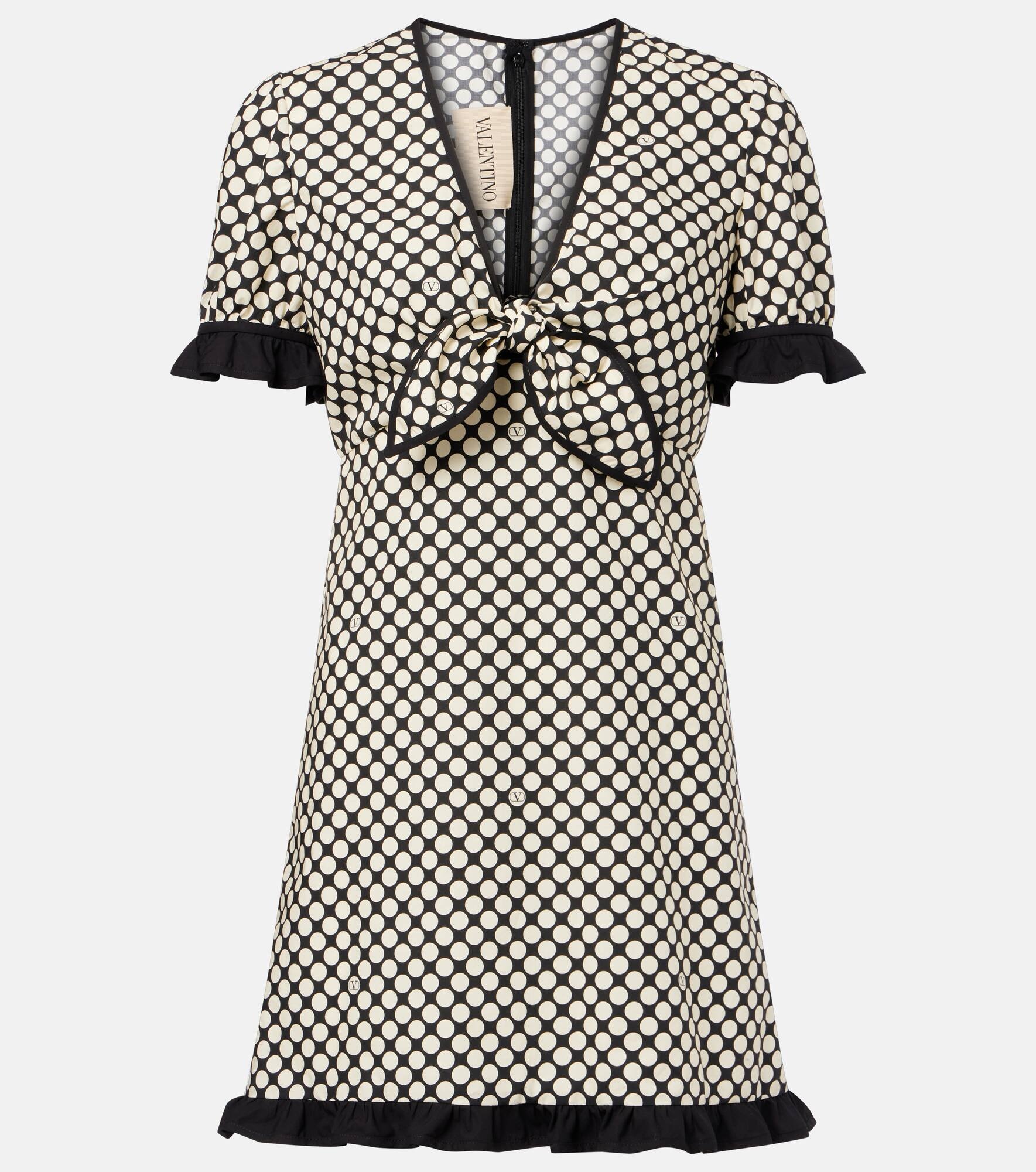 Part of the Escape collection, this Valentino minidress is cut from cotton poplin featuring the brand's Plus De Pois print. The design has sweet and slightly retro design elements like the knot detail and ruffle trims. Product Details - Material: 100% cotton - Care instructions: dry clean - Made in Italy - Designer color name: Nero/Bianco - Item color: black, white - Item number: P01055268