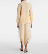 Cascading ruffles and a high neckline define the graceful silhouette of this Valentino silk blouse. Faux pearl buttons and gathered sleeves elevate the look with subtle elegance. Product Details - Material: 100% silk - Care instructions: dry clean - Made in Italy - Designer color name: Betulla - Item color: ivory - Closure: buttoned front - Item number: P01026728 Size & Fit - True to size - Semi-sheer - Straight fit - Non-stretchy fabric - Falls to the hip - The model seen in the picture is 178cm-5'10" and wearing a size IT 40
