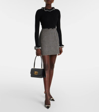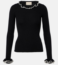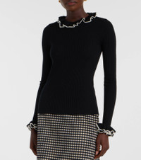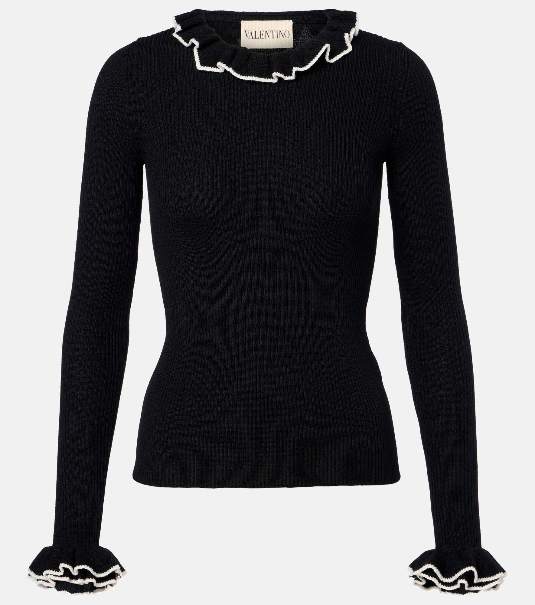 Expertly knitted from virgin wool, this Valentino sweater is a timeless wardrobe staple with a refined twist. This design features a contrasting ruffled collar and cuffs for a hint of romantic flair. Product Details - Material: 100% virgin wool - Care instructions: dry clean - Made in Italy - Designer color name: Nero/Avorio - Item color: black - Trim: 100% virgin wool - Cuff: ruffled - Item number: P01059804 Size & Fit - True to size - Fitted - Falls to the hip - The model seen in the picture is 178cm-5'10" and wearing a size XS