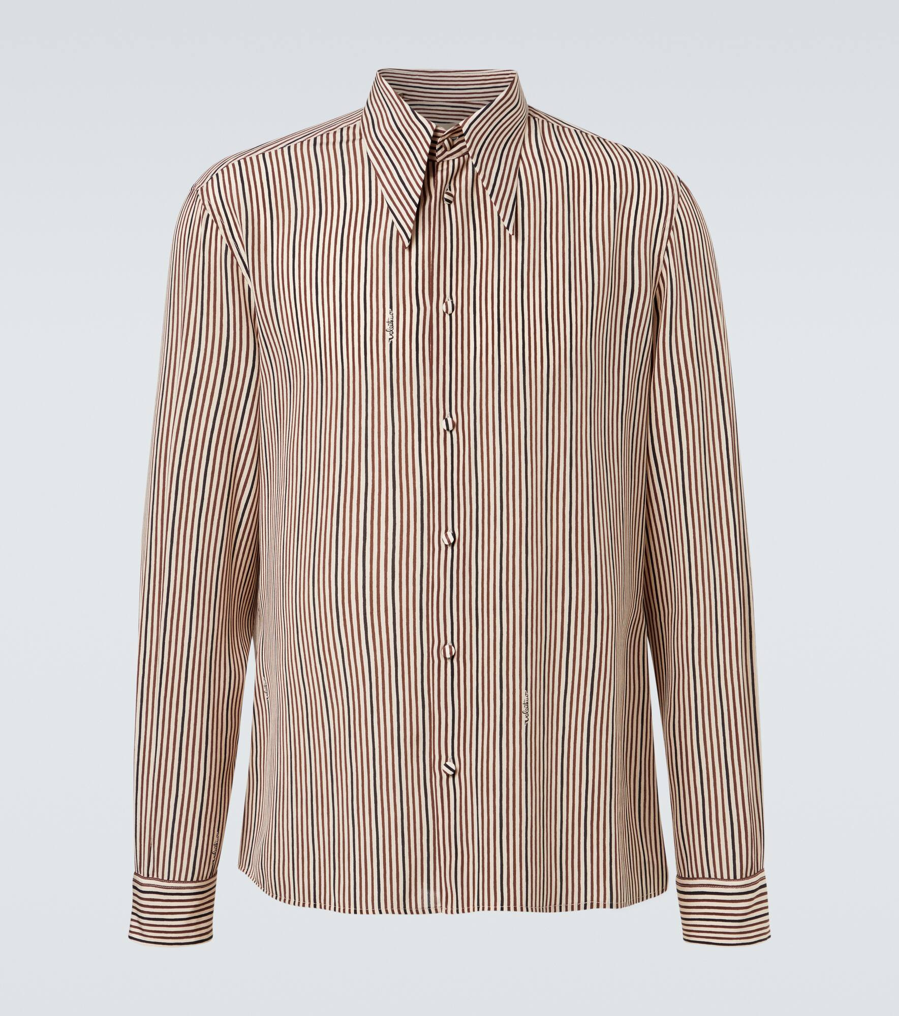 Excellently crafted designs are a hallmark of Valentino, the most established Italian Maison de Couture. This striped shirt is crafted entirely from silk and boasts subtle logo detailing. Product Details - Material: 100% silk - Care instructions: dry clean - Made in Italy - Designer color name: Nero/Marrone/Betulla - Item color: brown, black, beige - Collar: classic (Straight point) - Cuff: buttoned - Closure: buttoned placket - Item number: P01068287 Size & Fit - True to size - Without pleats in the back - Classic fit - Non-stretchy fabric - Falls below the hip - The model in the picture is 185cm-6'1" and wearing a size EU 41