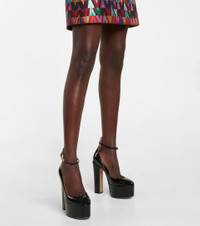 Dare to turn heads in Valentino Garavani’s Tan-Go patent leather pumps. Made in Italy, they’re set atop towering 155mm platform heels, and feature signature VLogo buckles. Product Details - Lining: leather - Upper: cow leather - Toe shape: round toe - Sole: leather insole and sole - Comes with a box, Comes with dust bag - Designer color name: Nero - Closure: buckle-fastening ankle strap - Made in Italy - Item number: P00640349 Size & Fit - True to size - Narrow at the toe - European sizes - 15,5cm-6" heel (size EU 38) - 6cm-2.5" platform (size EU 38)