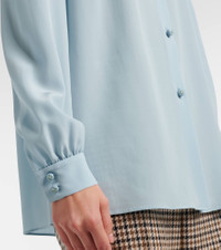 Turn to Valentino for endlessly elegant separates you'll wear again and again, like this shirt. The style is made from fluid silk crepe de chine and features a chic tie-neck. Product Details - Material: 100% silk - Care instructions: dry clean - Made in Italy - Color: blue - Designer color name: Celeste Chiaro - Item color: blue - Closure: buttoned front - Cuff: two buttons - Includes: garment bag - Item number: P01107815 Size & Fit - True to size - Designed for a loose fit - Non-stretchy fabric - Falls below the hip - The model seen in the picture is 178cm-5'10" and wearing a size IT 40