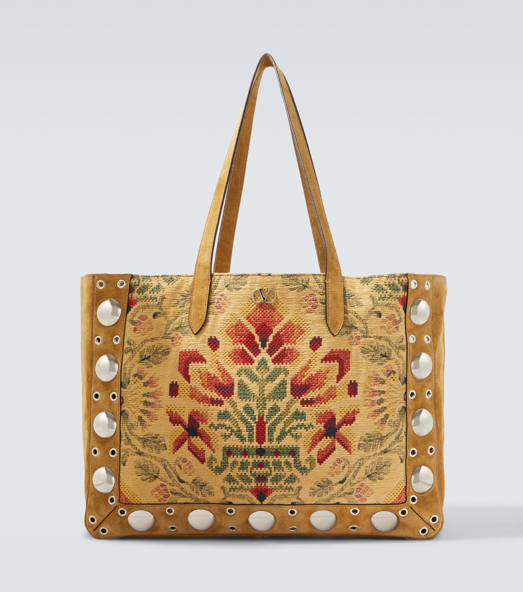Carry the essentials and more in the Valentino Garavani Nellcote shopper from Valentino Garavani. The leather-trimmed design boasts a floral jacquard construction, comes with a removable internal patch, and is finished with studded details. Product Details - Material: calf leather (suede), fabric - Lining: suede - Made in Italy - Designer color name: Multicolor/Havana Beige - Item color: beige - Hardware color: silver - Top handles - Internal details: single compartment - Closure: open top - Detachable zipped pouch - Item number: P01041294 Size & Fit - Height 34cm-13.5" - Width 46cm-18" - Depth 15cm-6" - Length of handles 66cm-26"