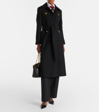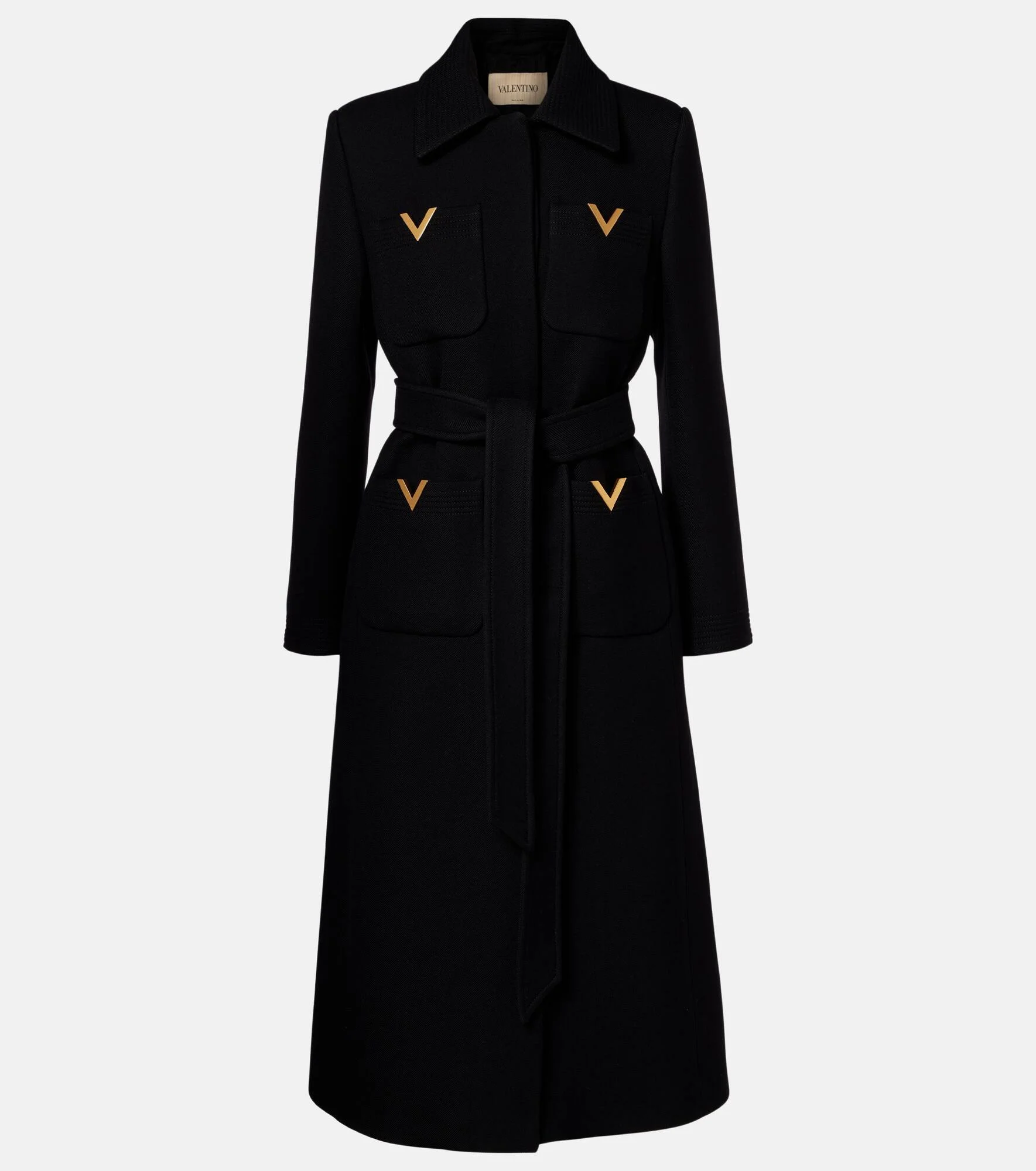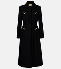 At once iconic and understated, Valentino's VGold carries the Maison's legacy of elegance. The emblem adorns the front patch pockets of this refined coat, made from wool and silk and finished with a self-tie belt. Product Details - Material: 99% wool, 1% silk - Care instructions: dry clean - Made in Italy - Color: black - Designer color name: Nero - Lining: 74% acetate, 26% silk - Embroidery: 100% polyester - Trim: 100% polyester - Hardware color: gold - Detachable belt - Pockets: patch pockets - Closure: concealed button placket - Item number: P01107835 Size & Fit - True to size - Shoulder pad inserts - Designed for a loose fit - Non-stretchy fabric - The model seen in the picture is 178cm-5'10" and wearing a size IT 40