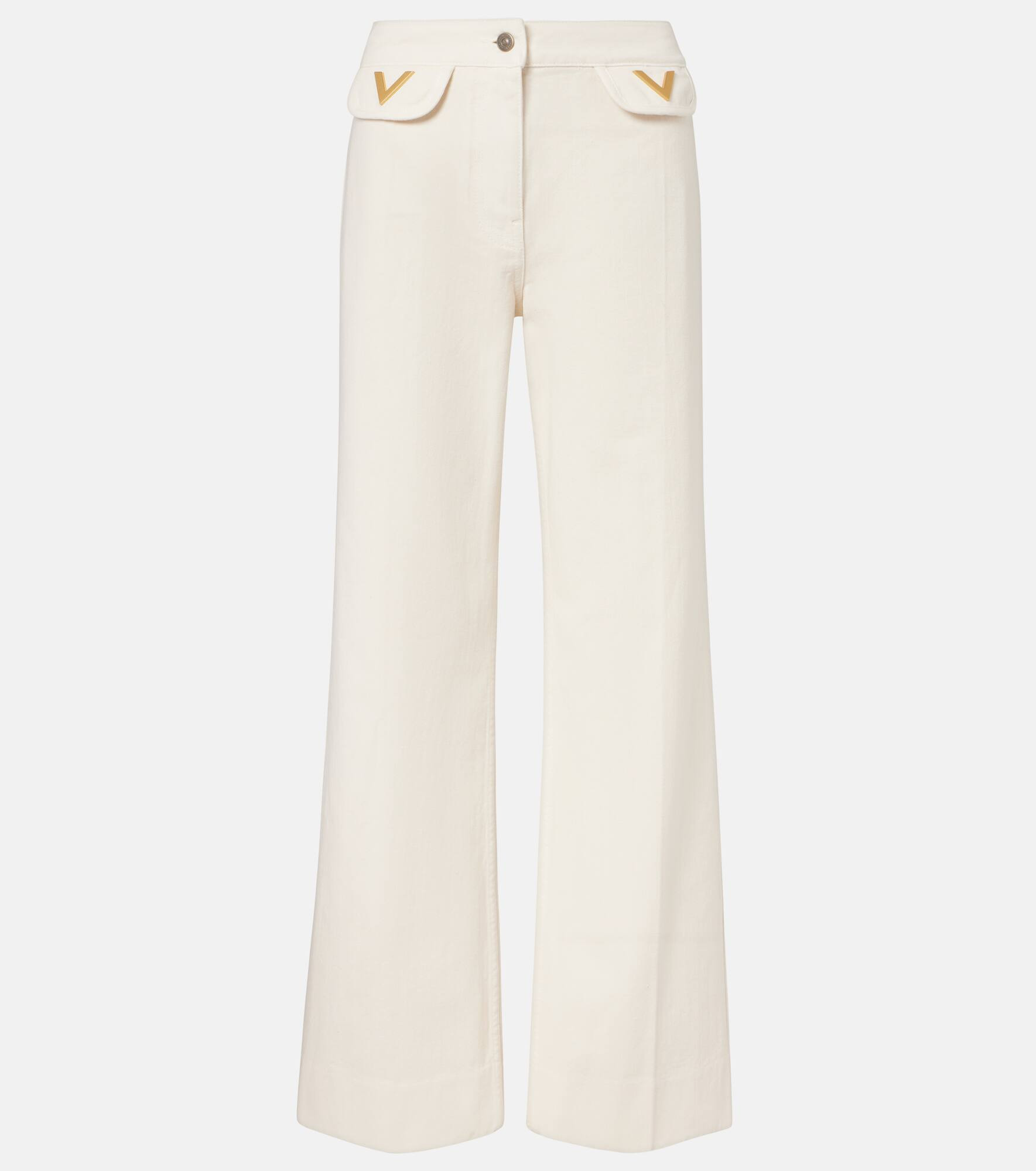 These jeans from Valentino are cut to a flattering wide leg silhouette with a mid-rise waist. The design is finished with front pleats and signature VGold hardware at the pockets for a refined touch. Product Details - Material: 100% cotton - Care instructions: hand wash - Made in Italy - Designer color name: Avorio - Item color: white - Details: 100% calf leather - Lining: 69% polyester, 31% cotton - Hardware color: gold - Closure: zip and button fastening - Pockets: flap pockets, back pockets - Single pleat - Item number: P01059770 Size & Fit - True to size - Non-stretchy fabric - Wide-leg - Sits low on the hips - The model seen in the picture is 178cm-5'10" and wearing a size IT 40