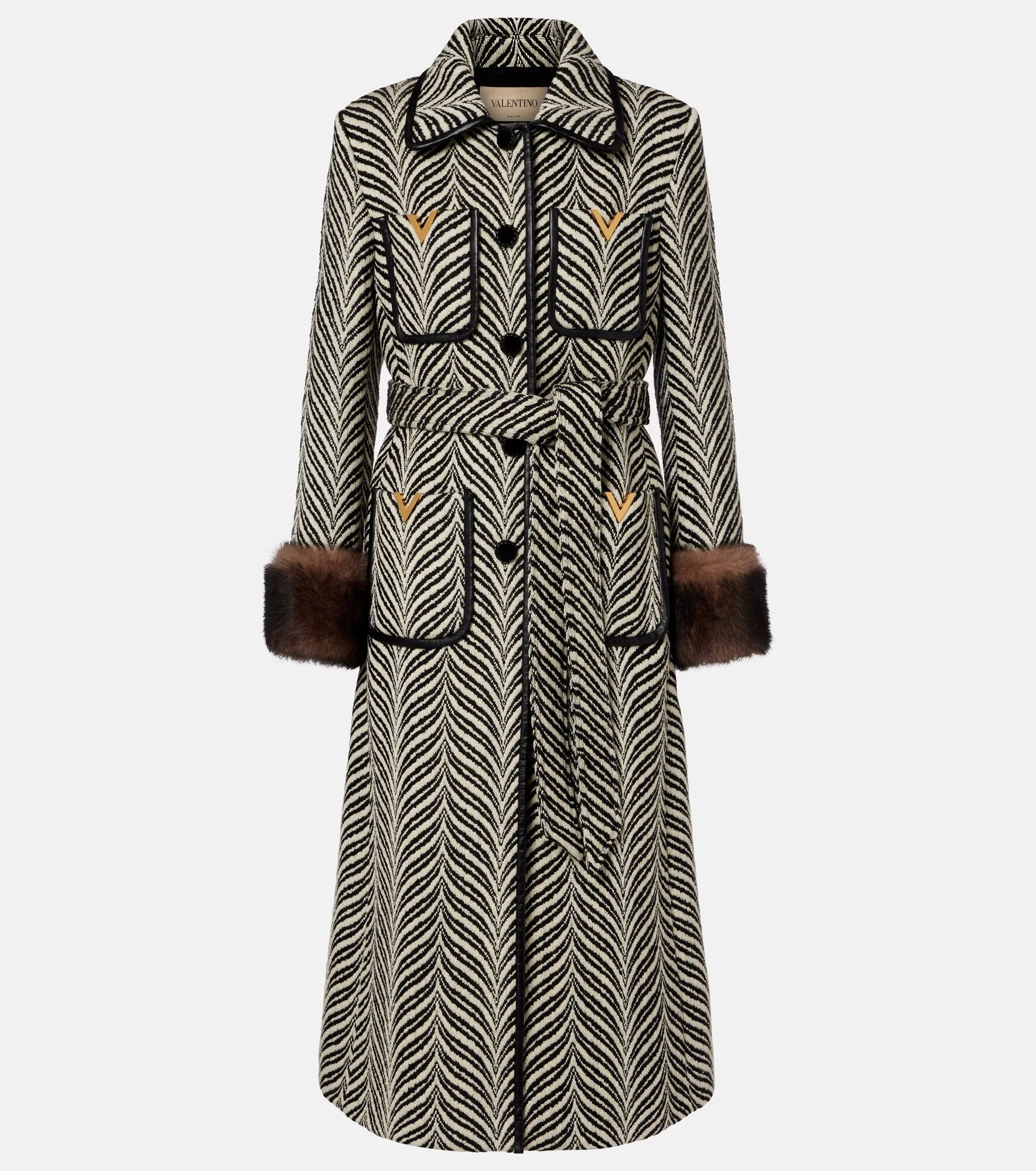 This luxe coat from Valentino is crafted in Italy from a wool-blend fabric with shearling detailing at the cuffs. The piece is finished with the Fauve Eclat zebra-inspired pattern and has leather trims and VGold hardware. Product Details - Material: 90% wool, 10% polyamide - Care instructions: dry clean - Made in Italy - Color: white - Designer color name: Burro/Nero - Hardware color: gold - Details: 100% shearling - Lining: 74% acetate, 26% silk - Trim: 100% polyester - Contains non-textile parts of animal origin - Pockets: patch pockets - Closure: snap-buttoned front - Detachable belt - Includes: dust bag - Item number: P01107836 Size & Fit - True to size - Shoulder pad inserts - Loose fit, comes with belt - Non-stretchy fabric - The model seen in the picture is 178cm-5'10" and wearing a size IT 40