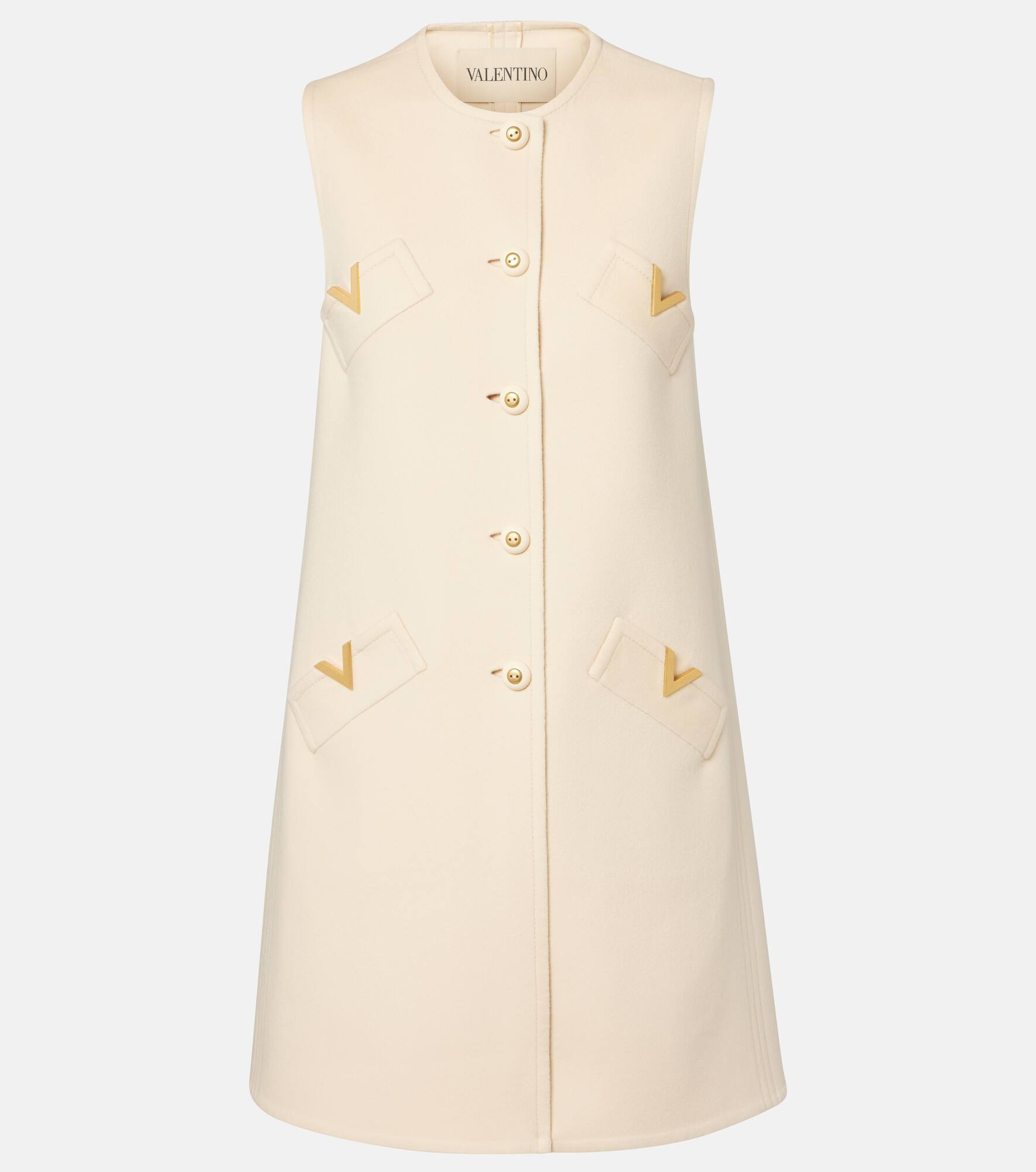 With VGold accents on the pockets, this candid minidress encapsulates Valentino's timeless elegance. This sleeveless style is crafted from a fine wool and cashmere blend with silk lining and a buttoned front. Product Details - Material: 90% wool, 10% cashmere - Care instructions: dry clean - Made in Italy - Designer color name: Betulla - Item color: beige - Pocket lining: 100% silk - Closure: buttoned front - Pockets: angled chest pockets, welt pockets - Hardware color: gold - Item number: P01059644 Size & Fit - True to size - Designed for a loose fit - Non-stretchy fabric - The model seen in the picture is 178cm-5'10" and wearing a size IT 40