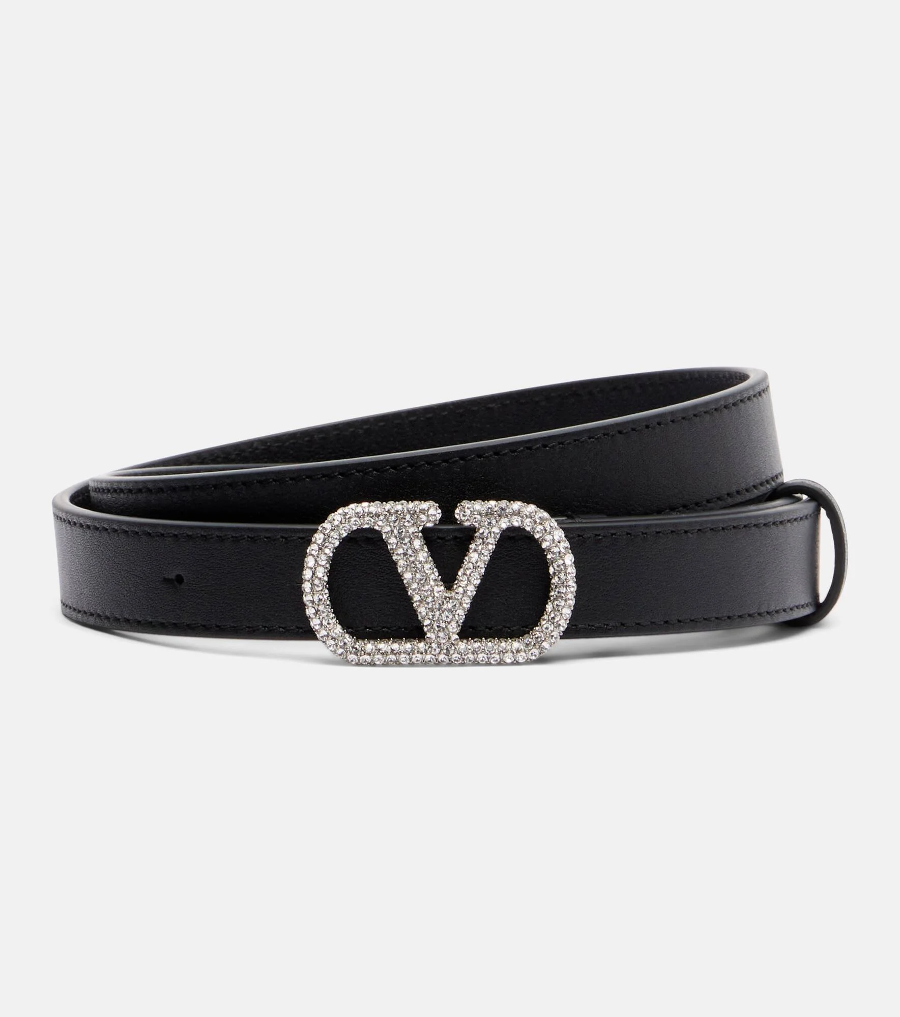 Your everyday looks deserve a statement-making finish, like this belt from Valentino Garavani. The design is made in Italy from supple leather and showcases the brand's VLogo crystal-embellished buckle in silver. Product Details - Material: leather - Lining: leather - Made in Italy - Designer color name: Nero - Item color: black - Hardware color: silver - Includes: box, dust bag - Item number: P01127199 Size & Fit - Width 2cm-1" - Buckle width 2.7cm-1"