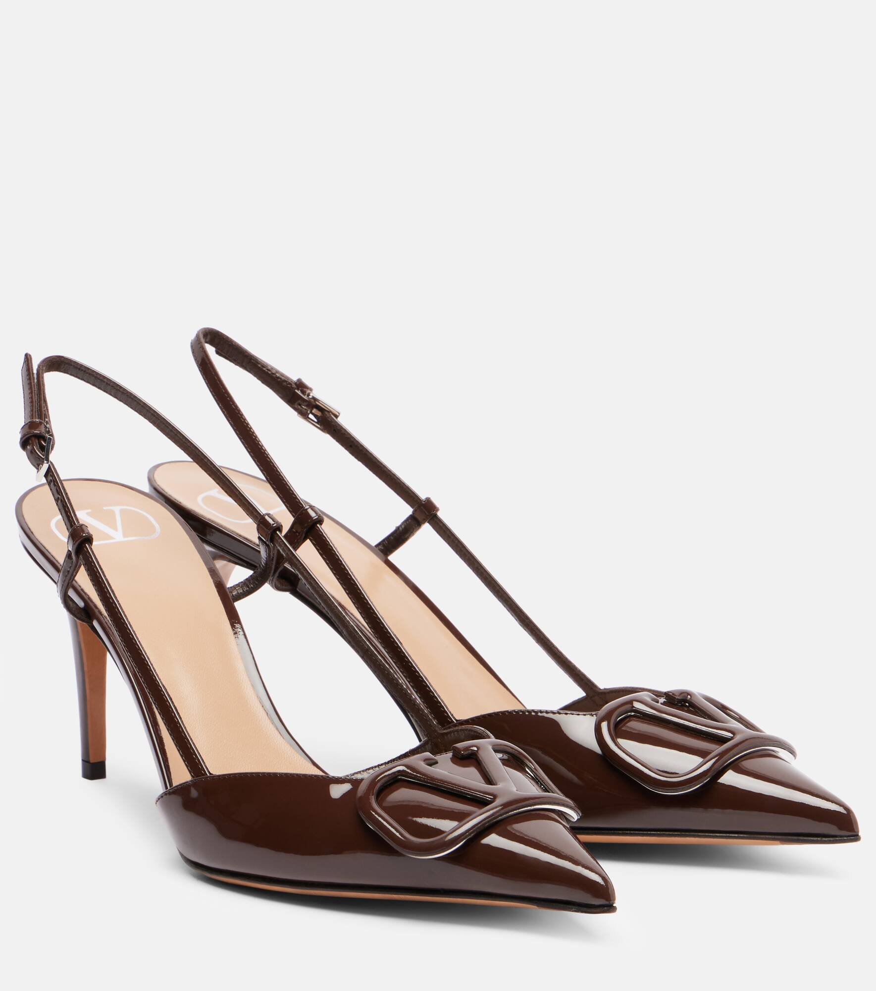 At once iconic and understated, Valentino Garavani's VLogo carries the Maison's legacy of elegance. Made in Italy from brown patent leather, these slingback pumps feature a tonal rendition of the brand's signature. Product Details - Upper: calf leather - Lining: leather - Sole: leather insole and sole - Toe shape: pointed toe - Made in Italy - Includes: dust bag, shoe box - Designer color name: Bark Brown - Item color: brown - Closure: buckle fastening - Item number: P01102146 Size & Fit - Fits slightly large to size - we recommend trying a half size smaller - European sizes - 8cm-3" heel (size EU 38)