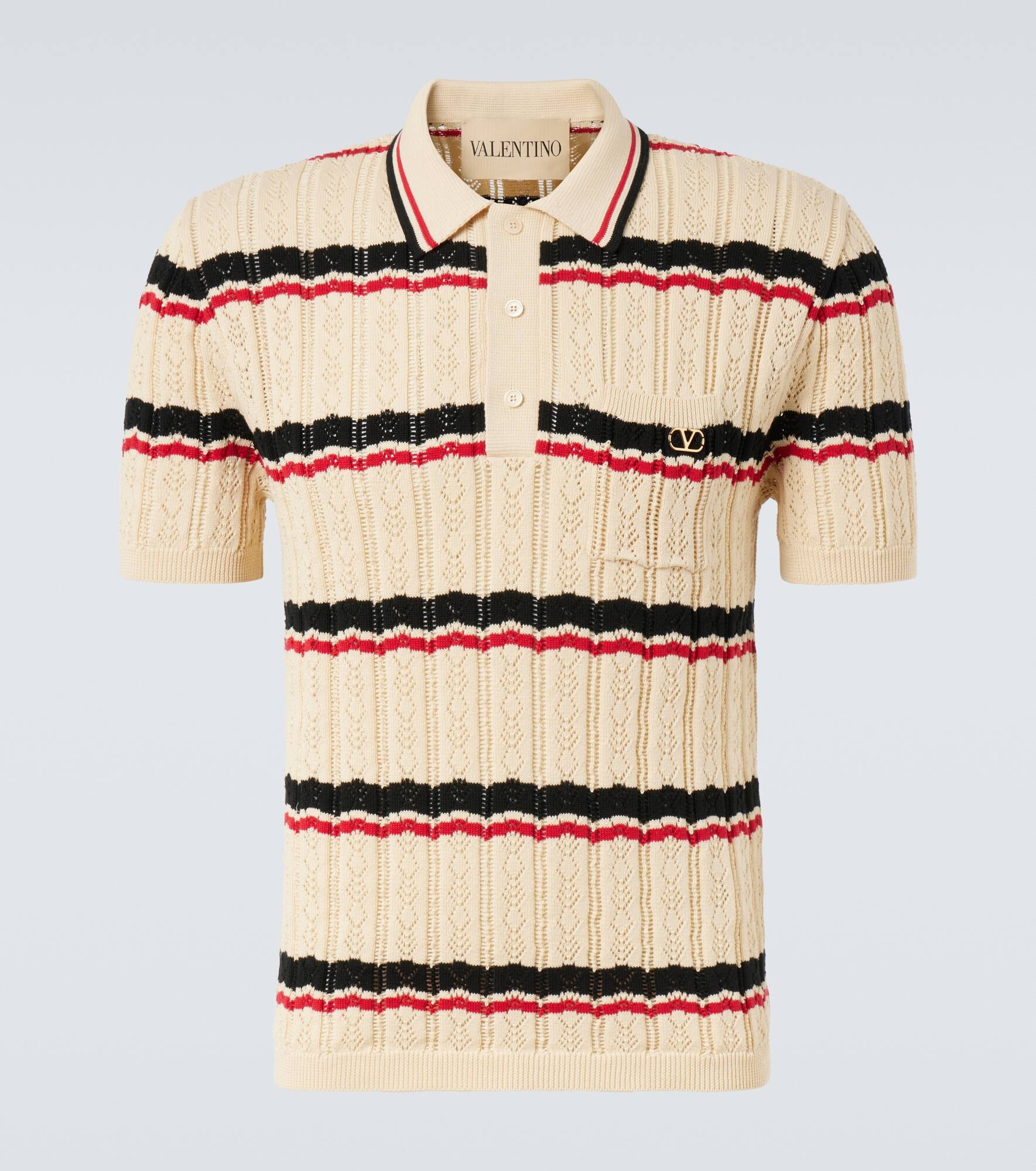 At once iconic and understated, Valentino Garavani's VLogo carries the Maison's legacy of elegance. This polo shirt is crafted from pointelle-knit cotton with stripes and features the iconic motif. Product Details - Material: 100% cotton - Care instructions: dry clean - Made in Italy - Designer color name: Burro/Nero/Carminio - Item color: beige, black, red - Hardware color: gold - Collar: polo collar - Contains non-textile parts of animal origin - Item number: P01041269 Size & Fit - True to size - Slim fit - Stretchy fabric - Falls to the hip - Height of model is 189cm-74.5" and wears a size L