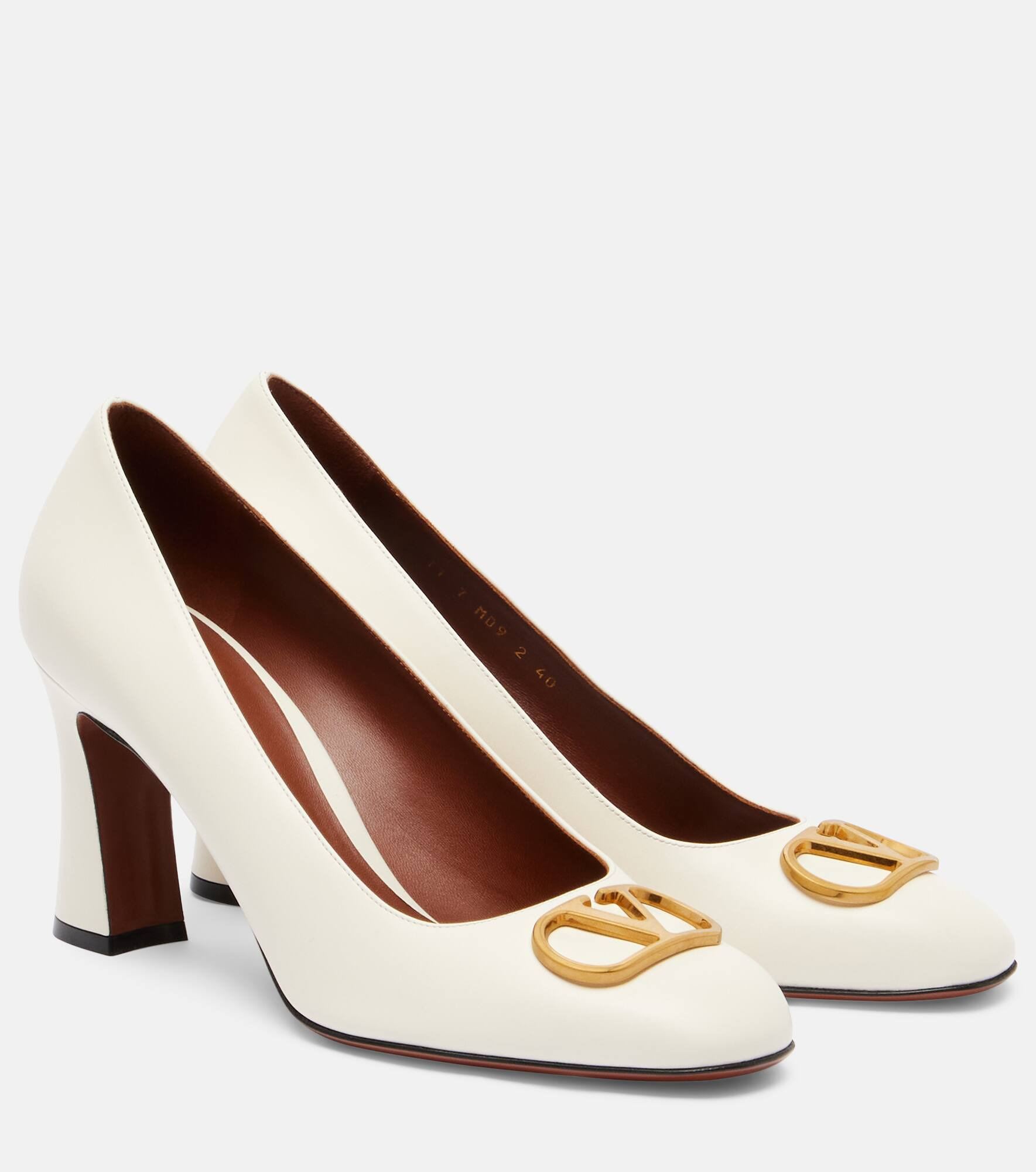 The Valentino Garavani VLogo Signature pumps are crafted from smooth leather with a round toe and an 80mm comfortable block heel. A VLogo Signature detail at the front adds a refined, chic touch. Product Details - Upper: leather - Lining: leather - Sole: leather insole, leather and rubber sole - Toe shape: round toe - Made in Italy - Includes: dust bags, shoe box - Designer color name: Ivory - Item color: white - Hardware color: gold - Item number: P01062141 Size & Fit - True to size - For narrow feet, we recommend trying a half size smaller - 8cm-3" heel (size EU 38)