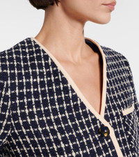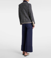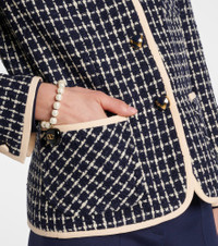 Well-designed pieces like this Valentino jacket are what set your closet apart from others. This piece comes fully lined and is cut from boucle made from a wool and cotton blend. Product Details - Material: 77% wool, 17% cotton, 6% polyamide - Care instructions: dry clean - Made in Italy - Designer color name: Navy/Avorio - Item color: blue, ivory - Material II: 65% wool, 35% silk - Lining: 75% acetate, 25% silk - Trim: 100% polyester - Hardware color: gold, blue - Closure: buttoned front - Collar: V-neck - Cuff: four buttons - Pockets: patch pockets - Fully lined - Shoulder pads - Item number: P01059636 Size & Fit - True to size - Shoulder pad inserts - Straight fit - Non-stretchy fabric - Falls below the hip - The model seen in the picture is 178cm-5'10" and wearing a size IT 40