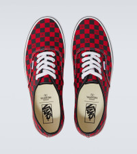 Valentino Garavani's signature style meets Vans' iconic construction in these vibrant sneakers. Made from canvas, this pair comes with a bright VLogo Checkerboard print all over. Product Details - Upper: fabric - Lining: fabric - Sole: fabric insole, rubber sole - Toe shape: round toe - Made in Vietnam - Includes: shoe box - Designer color name: Rouge Pur-Nero/Nero/Bia-Ne-Mie - Item color: black, red - Closure: lace-up - Item number: P01068319