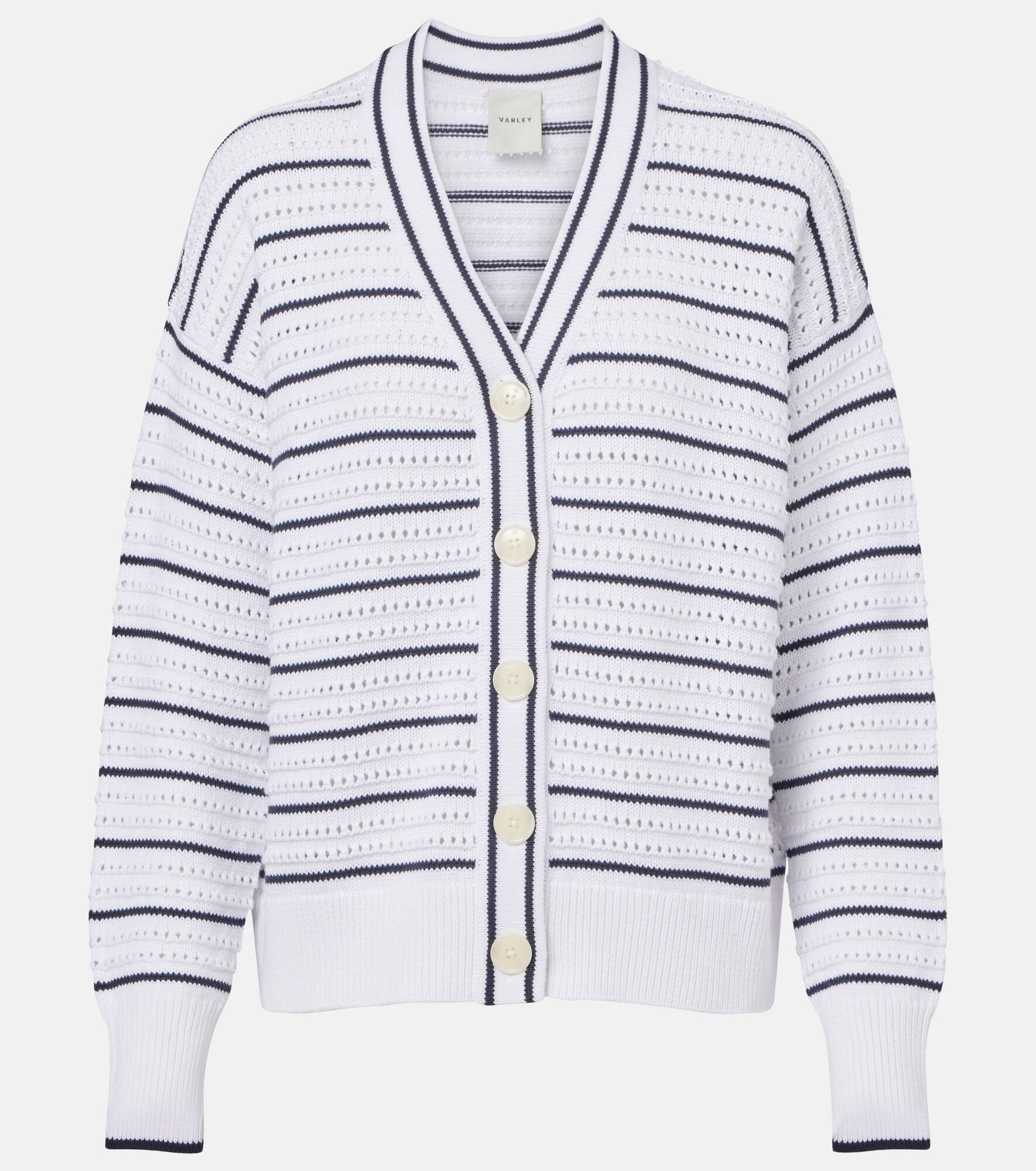 Varley's Antonia cardigan is the epitome of contemporary chic. Intricately open-knit from pure, soft cotton, it's detailed with ribbed trims, contrasting stripes, and dropped shoulders for a comfortable, relaxed fit. Product Details - Material: 100% cotton - Care instructions: machine wash at 30 degrees - Made in China - Designer color name: White / Blue Nights - Item color: white - Closure: buttoned front - Item number: P01062259 Size & Fit - True to size - Dropped shoulders - Designed for a loose fit - Slightly stretchy fabric - Falls to the hip - The model seen in the picture is 178cm-5'10" and wearing a size XS