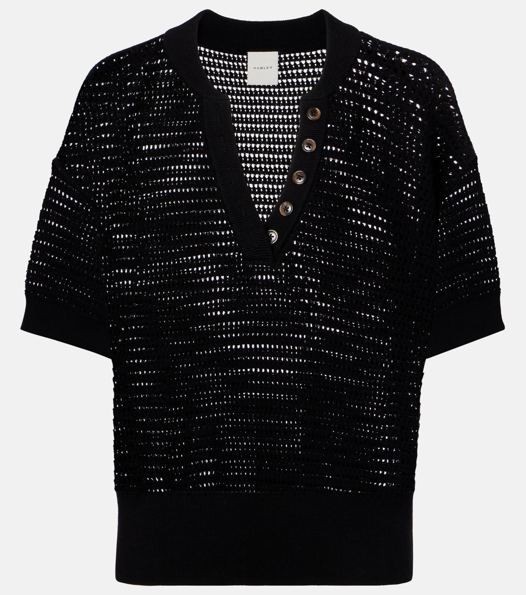 Crafted from lightweight cotton mesh, the Callie top from Varley is an effortless option with its open-knit structure and oversized shape. Designed with short sleeves, this piece features a half-buttoned closure that creates a flattering V-neckline. Product Details - Material: 100% cotton - Care instructions: machine wash at 30 degrees - Made in China - Designer color name: Black - Item color: black - Closure: buttoned placket - Cuff: ribbed - Hem: ribbed - Item number: P01082468 Size & Fit - True to size - Dropped shoulders - Straight fit - Slightly stretchy fabric - Falls to the hip - The model seen in the picture is 178cm-5'10" and wearing a size XS