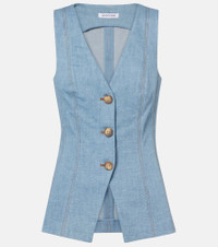The Avalina denim vest from Veronica Beard features a sleeveless style with a buttoned front. This piece is finished with a deep V-neckline and angled seams that create a Y-line silhouette. Product Details - Material: 98% cotton, 2% elastane - Care instructions: dry clean - Made in China - Designer color name: Blue Mirage - Item color: blue - Lining: 100% polyester - Collar: V-neck - Closure: buttoned front - Partially lined - Item number: P01097598 Size & Fit - True to size - Cinched waist - Stretchy fabric - Falls below the hip - The model seen in the picture is 178cm-5'10" and wearing a size US 4