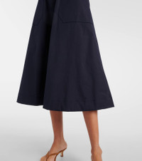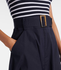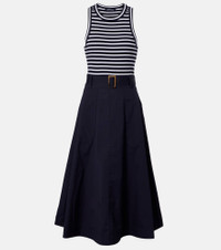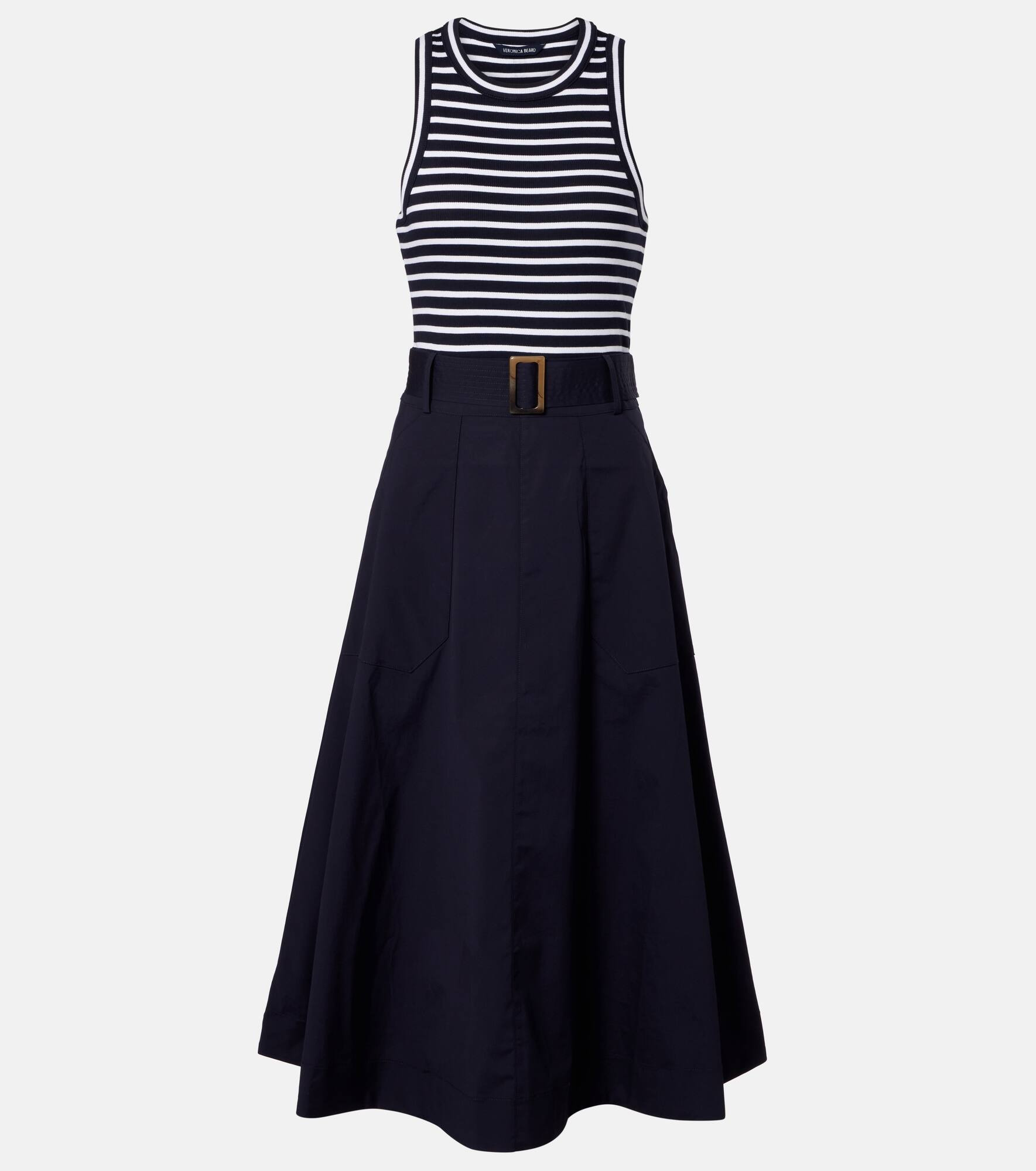 Veronica Beard's low-effort, high-impact separates hit the sweet spot between casual and chic. Crafted from a soft cotton blend, this midi dress features a striped bodice, flowing skirt, and a detachable belt to cinch the waist. Product Details - Material: 96% cotton, 4% elastane - Care instructions: machine wash cold - Made in Vietnam - Designer color name: Navy/White - Item color: blue, white - Material II: 97% cotton, 3% elastane - Attached belt - Belt loops - Pockets: slant pockets - Item number: P01097277 Size & Fit - True to size - Adjustable at the waist - Fitted bodice, loose skirt - Partly stretchy fabric - The model seen in the picture is 178cm-5'10" and wearing a size XS