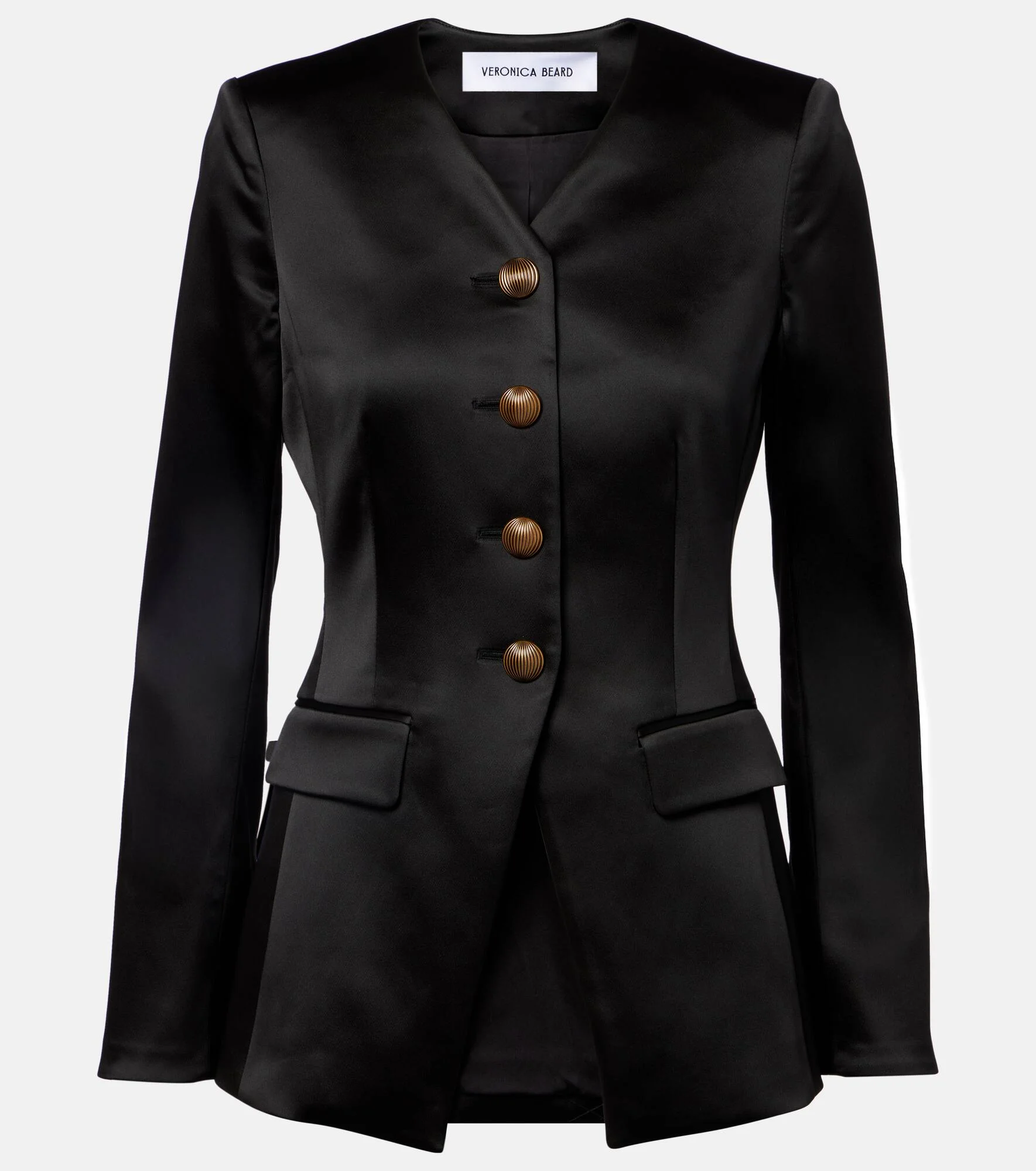 Veronica Beard's low-effort, high-impact separates find the perfect balance between casual and chic. The Cynthia blazer is crafted from lustrous satin, and the sheath silhouette is finished with elegant brown-hued buttons. Product Details - Material: 48% acetate, 45% polyamide, 7% elastane - Care instructions: dry clean - Made in the USA - Designer color name: Black - Item color: black - Lining: 96% polyester, 4% elastane - Closure: buttoned front - Pockets: flap pockets - Vent: single - Item number: P01113792 Size & Fit - True to size - Shoulder pad inserts - Cinched waist - Non-stretchy fabric - Falls below the hip - The model seen in the picture is 178cm-5'10" and wearing a size US 4