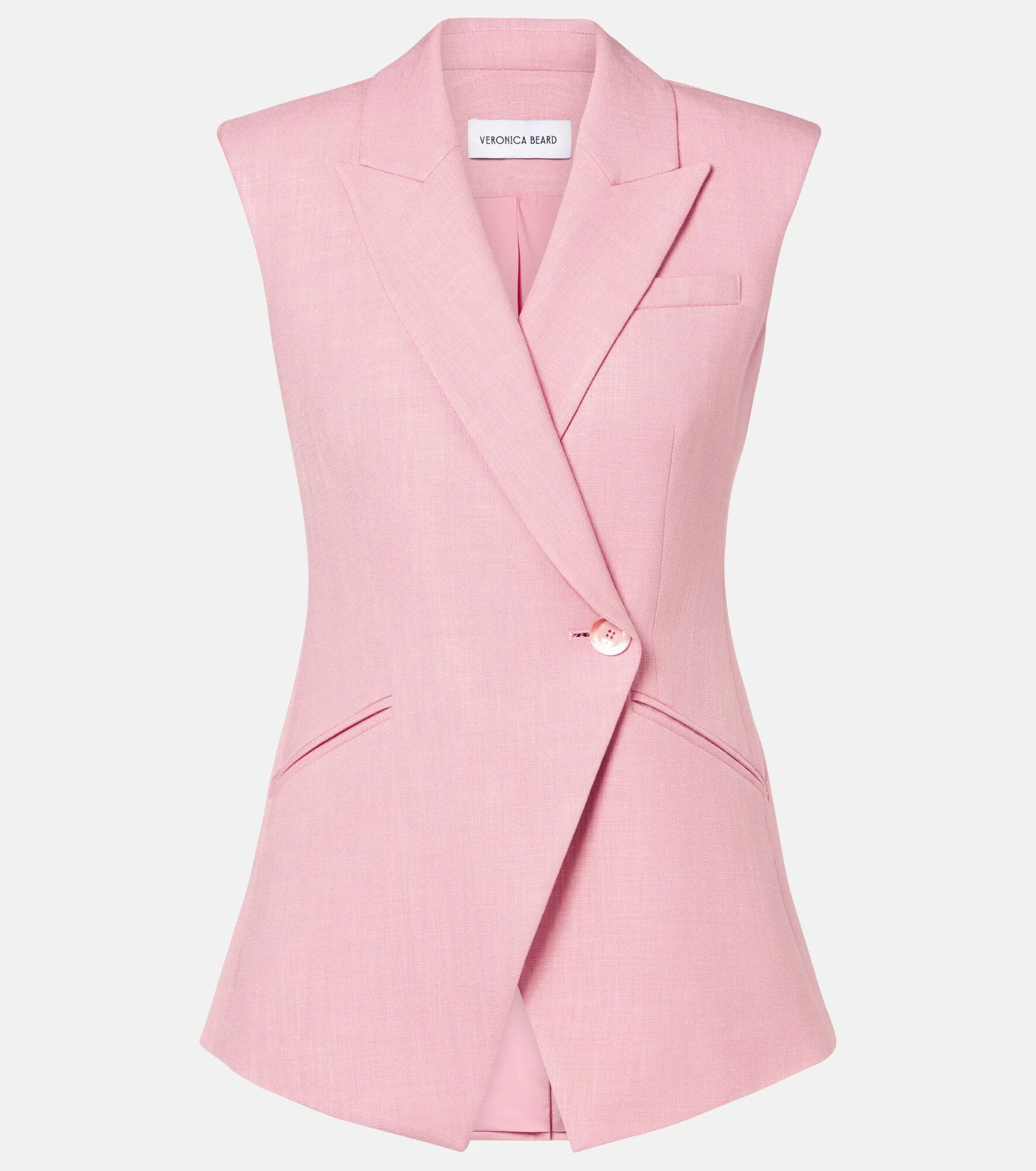 Veronica Beard's low-effort, high-impact separates find the perfect balance between casual and chic. Presented in a delicate pink hue, this vest features a double-breasted front and a peak lapel. Product Details - Material: 98% viscose, 2% elastane - Care instructions: dry clean - Made in the USA - Color: pink - Designer color name: Petal - Lining: 100% polyester - Peak lapel - Closure: double-breasted buttoned front - Pockets: jetted - Vent: single - Item number: P01154750 Size & Fit - True to size - Shoulder pad inserts - Cinched waist - Non-stretchy fabric - Falls below the hip - The model seen in the picture is 178cm-5'10" and wearing a size US 4