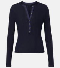Veronica Beard's low-effort, high-impact separates find the perfect balance between casual and chic. The Drexler Henley shirt boasts a ribbed-knit finish and a half-buttoned front. Product Details - Material: 96% polyester, 4% elastane - Care instructions: machine wash cold - Made in Vietnam - Color: blue - Designer color name: Navy - Trim: 100% polyester - Closure: partially buttoned front - Item number: P01142612 Size & Fit - True to size - Fitted - Stretchy fabric - Falls to the hip - The model seen in the picture is 178cm-5'10" and wearing a size XS