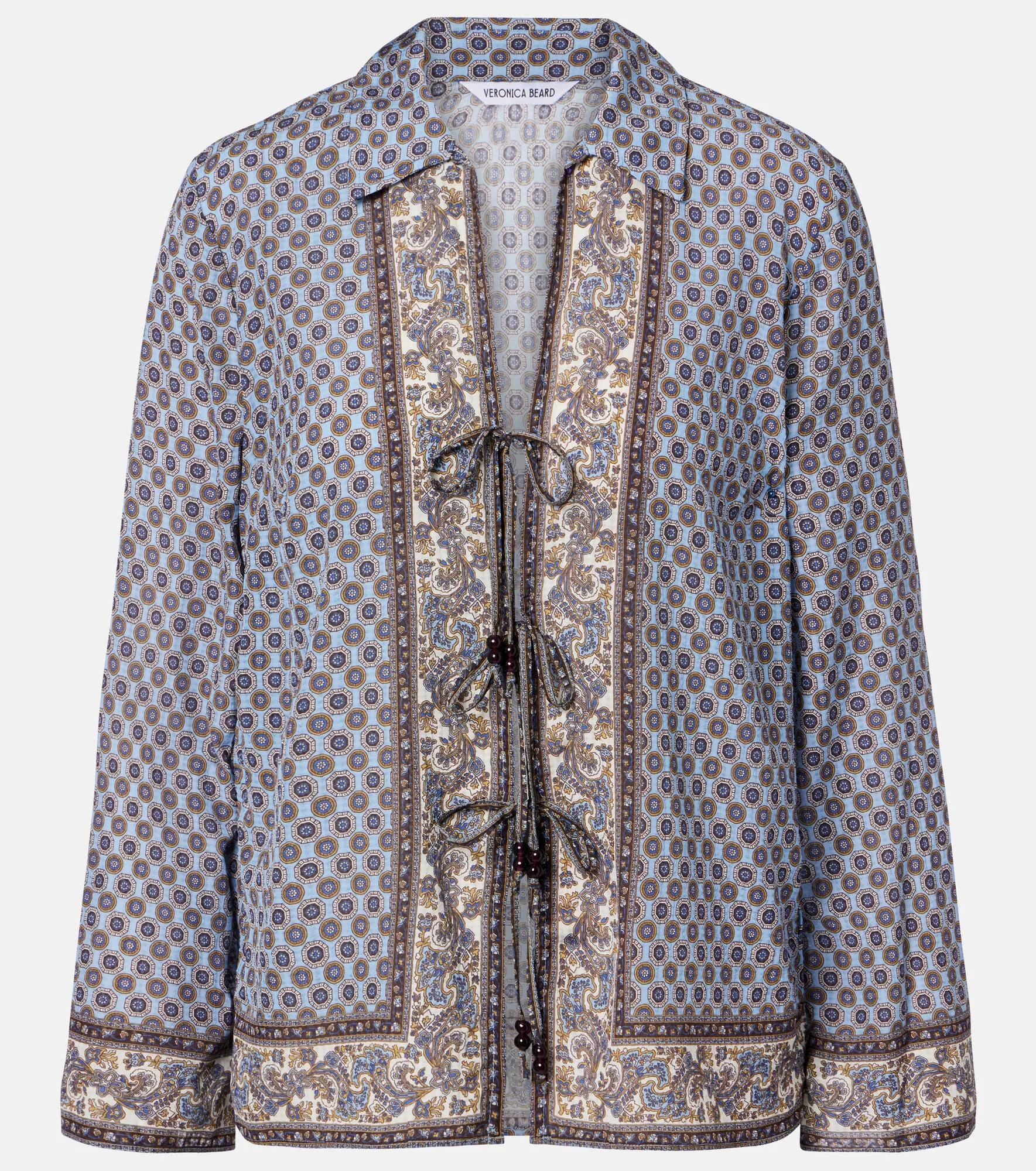 Veronica Beard's low-effort, high-impact separates find the perfect balance between casual and chic. The Eva blouse features a front self-tie closure and a colorful print. Product Details - Material: 70% viscose, 30% cotton - Care instructions: dry clean - Made in India - Color: blue - Designer color name: Blue Jay Multi - Material II: 70% viscose, 30% cotton - Collar: classic (Straight point) - Closure: self-ties - Item number: P01154755 Size & Fit - True to size - Straight fit - Non-stretchy fabric - Falls to the hip - The model seen in the picture is 178cm-5'10" and wearing a size US 4