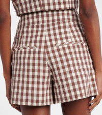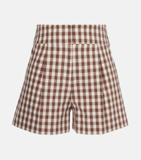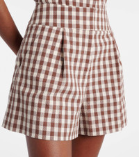 Crafted from cotton seersucker, the Haina shorts from Veronica Beard feature a flattering high-waisted, A-line silhouette. Complemented by front pleats and side and back pockets, the design is complete with a charming all-over gingham print. Product Details - Material: 98% cotton, 2% elastane - Care instructions: dry clean - Made in the USA - Designer color name: Light Chickory/Dove - Item color: brown, ivory - Closure: zip, hook, and button fastening - Pockets: side slit pockets, back pockets - Lining: 100% viscose - Item number: P01067025 Size & Fit - True to size - Non-stretchy fabric - Straight leg - High-waisted - The model seen in the picture is 178cm-5'10" and wearing a size US 4