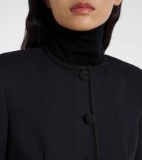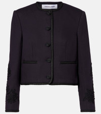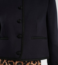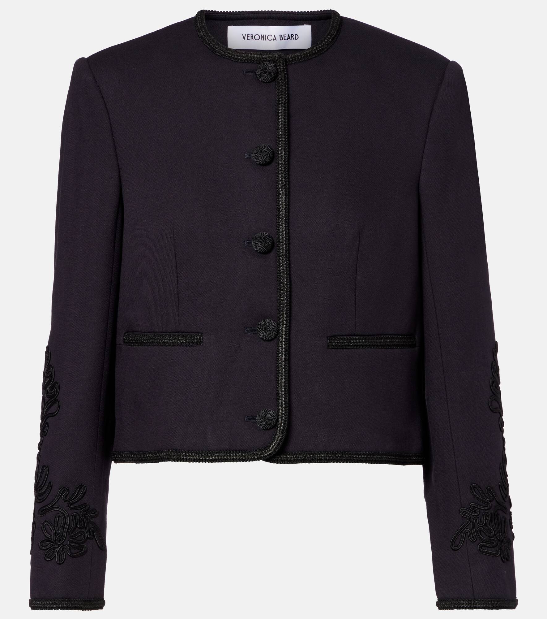 The Latrell navy jacket from Veronica Beard features a collarless, cropped silhouette and structured fit. Detailed with intricate embroidery, braided trim, and covered buttons, this piece transitions seamlessly from day to night. Product Details - Material: 64% viscose, 20% acrylic, 8% wool, 8% polyester - Care instructions: dry clean - Made in China - Designer color name: Navy - Item color: blue - Lining: 100% viscose - Cuff: four buttons - Pockets: welt pockets - Closure: buttoned front - Item number: P01096287 Size & Fit - True to size - Shoulder pad inserts - Straight fit - Non-stretchy fabric - Slightly cropped - The model seen in the picture is 178cm-5'10" and wearing a size US 4