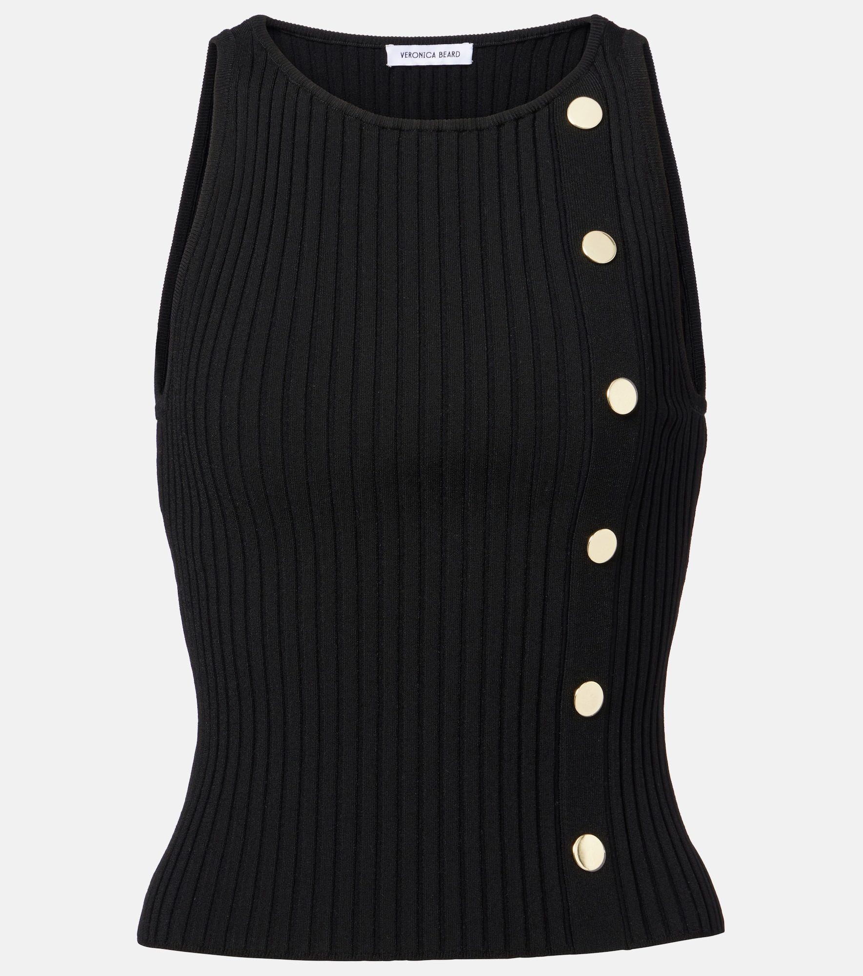 The Nelson top from Veronica Beard features a sleeveless, fitted silhouette, complemented by a stretchy, ribbed-knit construction. The design is complete with mirrored button embellishments down the side for a touch of glamour. Product Details - Material: 64% viscose, 20% nylon, 14% polyester, 2% elastane - Care instructions: dry clean - Made in China - Designer color name: Black - Item color: black - Item number: P01067074 Size & Fit - True to size - Fitted - Stretchy fabric - Slightly cropped - The model seen in the picture is 178cm-5'10" and wearing a size XS