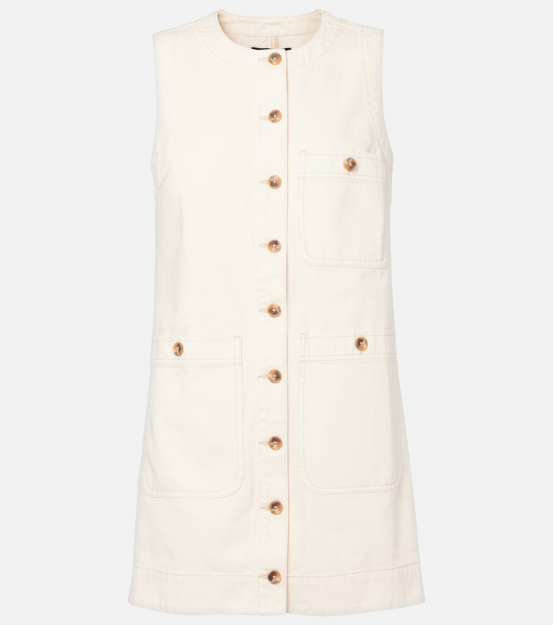 Veronica Beard's low-effort, high-impact separates hit the sweet spot between casual and chic. Made from pure cotton denim, the Oakley minidress features a minimalist silhouette with patch pockets, contrast topstitching, and a buttoned front. Product Details - Material: 100% cotton - Care instructions: machine wash cold - Made in China - Designer color name: Ecru - Item color: beige - Closure: buttoned front - Pockets: patch pockets - Item number: P01067085 Size & Fit - True to size - Straight fit - Non-stretchy fabric - The model seen in the picture is 178cm-5'10" and wearing a size US 4