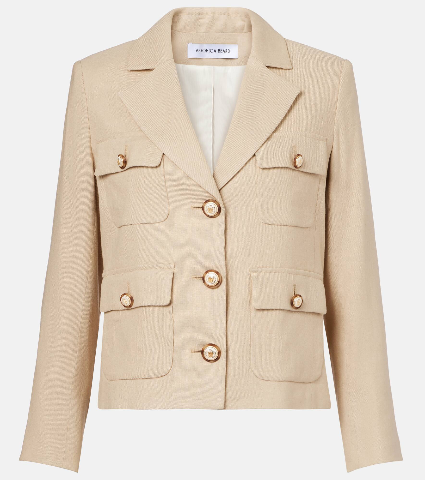 Sophisticated yet effortless, the Schuyler blazer from Veronica Beard is made from a linen blend. Featuring signature two-toned crest buttons, this single-breasted style is complete with notched lapels and four flap pockets. Product Details - Material: 55% linen, 44% viscose, 1% elastane - Care instructions: dry clean - Made in Vietnam - Designer color name: Stone Khaki - Item color: beige - Blazer - Pockets: flap chest pockets, flap pockets - Notched lapel - Vent: single - Cuff: four buttons - Item number: P01083804 Size & Fit - True to size - Shoulder pad inserts - Straight fit - Non-stretchy fabric - Falls to the hip - The model seen in the picture is 178cm-5'10" and wearing a size US 4