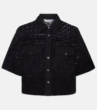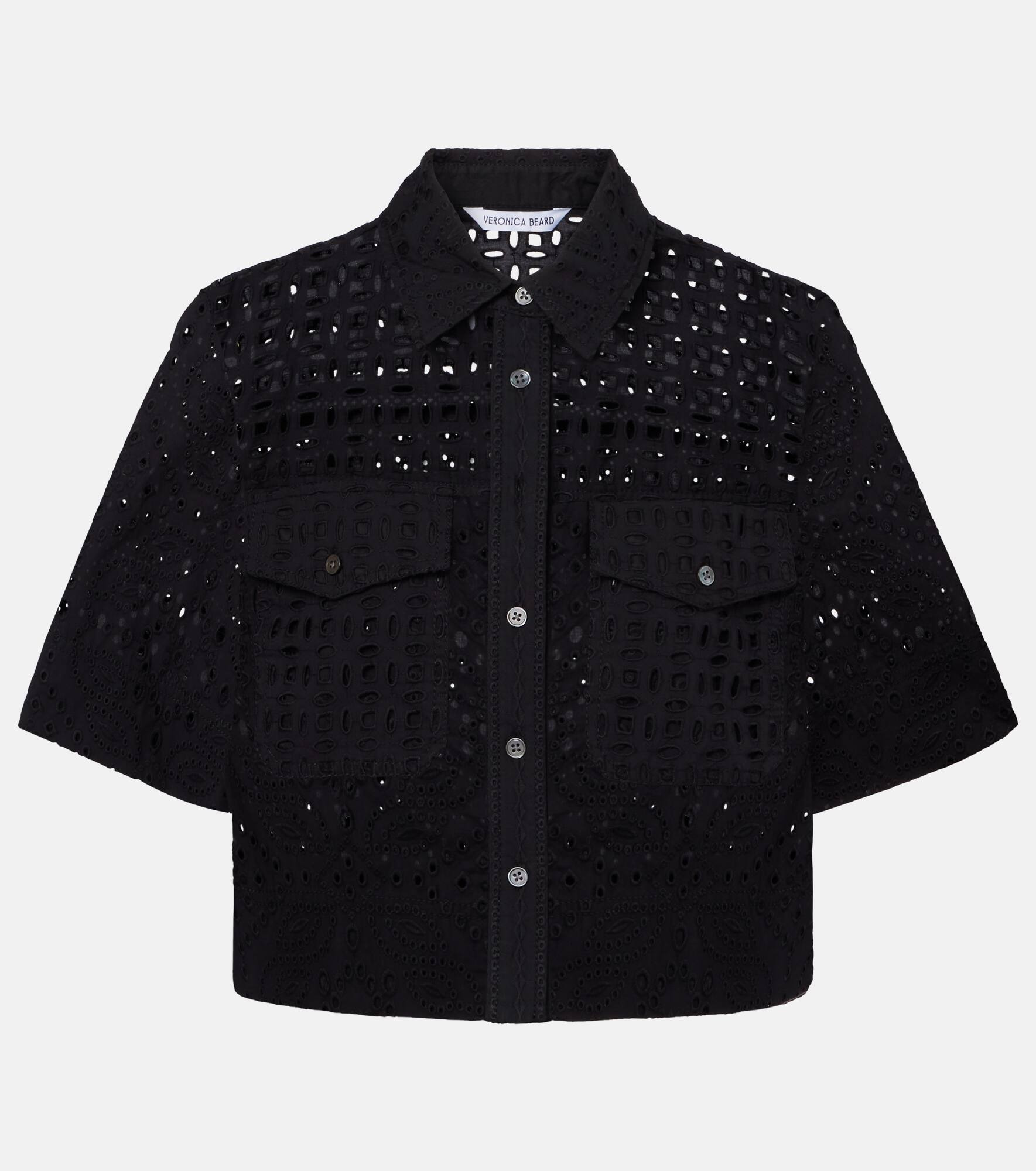 The Spruce shirt from Veronica Beard brings charm and character to your warm-weather wardrobe. Crafted from pure cotton to a cropped, boxy silhouette, this style features a playful allover eyelet design. Product Details - Material: 100% cotton - Care instructions: hand wash - Made in China - Designer color name: Black - Item color: black - Closure: buttoned front - Pockets: buttoned pockets - Item number: P01067036 Size & Fit - True to size - Designed for a loose fit - Non-stretchy fabric - Slightly cropped - The model seen in the picture is 178cm-5'10" and wearing a size US 4