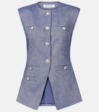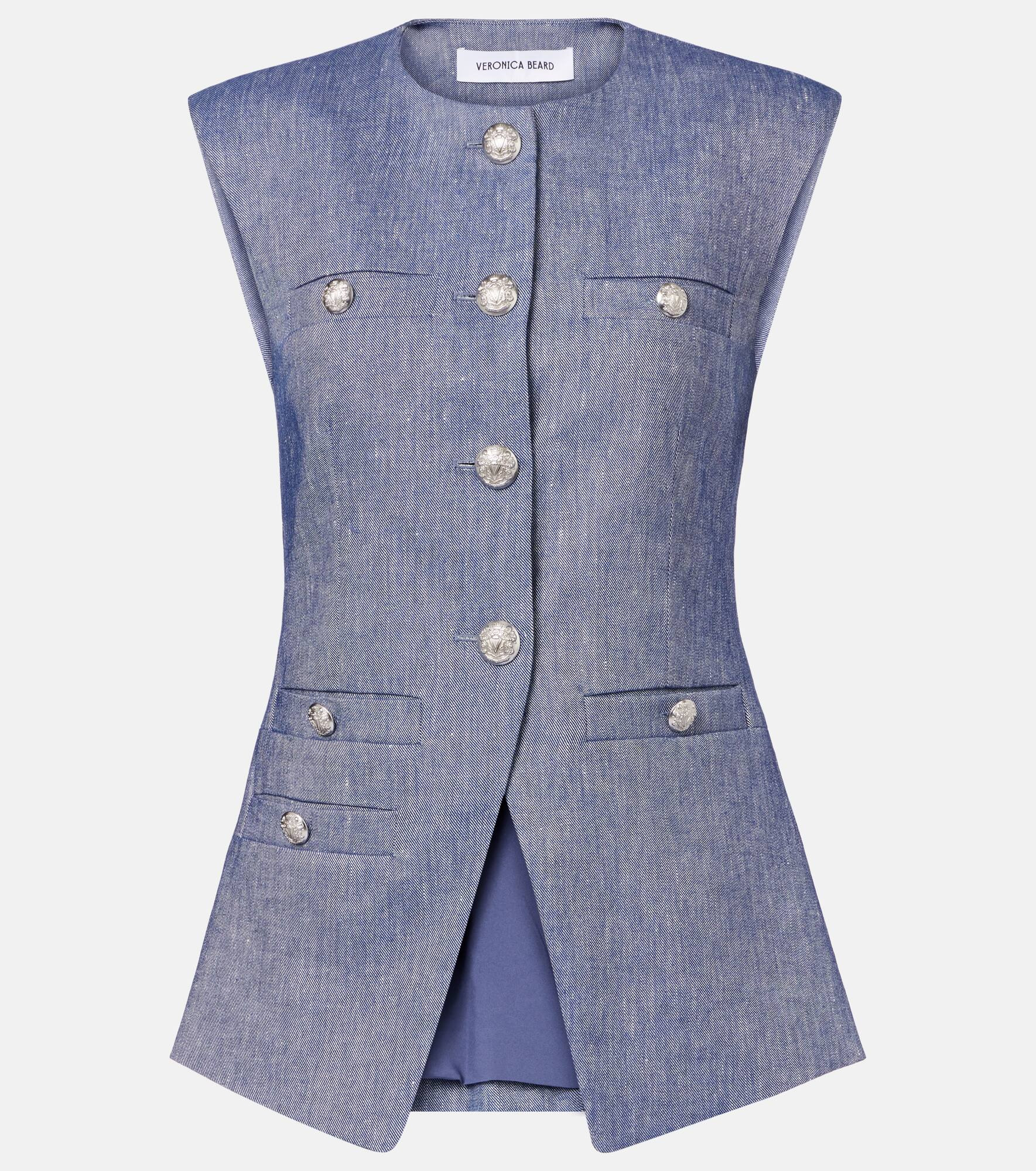 Tailored to perfection from linen blend, the Tamara vest from Veronica Beard is adorned with bold crest buttons. Finished with four welt pockets, this style can be worn as a sophisticated top layer or solo. Product Details - Material: 53% linen, 29% polyester, 16% viscose, 2% elastane - Care instructions: dry clean - Made in the USA - Designer color name: Blue Melange - Item color: blue - Lining: 100% polyester - Closure: buttoned front - Pockets: welt pockets - Shoulder pads - Vent: single - Item number: P01083712 Size & Fit - True to size - Shoulder pad inserts - Cinched waist - Non-stretchy fabric - Falls to the hip - slit length 17cm-6.5" - The model seen in the picture is 178cm-5'10" and wearing a size US 4