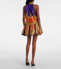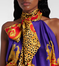 Versace commands attention with this sleeveless printed silk satin top, expertly crafted to highlight its fluid silhouette. The statement bow detail adds a bold and sophisticated accent, perfectly embodying the house’s signature blend of elegance and daring design. Product Details - Material: 100% silk - Care instructions: dry clean - Made in Italy - Designer color name: Ultramarine + Scarlet - Item color: multicolor - Closure: button fastening - Self-tie neck - Item number: P01080594 Size & Fit - True to size - Designed for a loose fit - Non-stretchy fabric - Falls below the hip - Height of model is 174cm-68.5" and wears a size IT 40