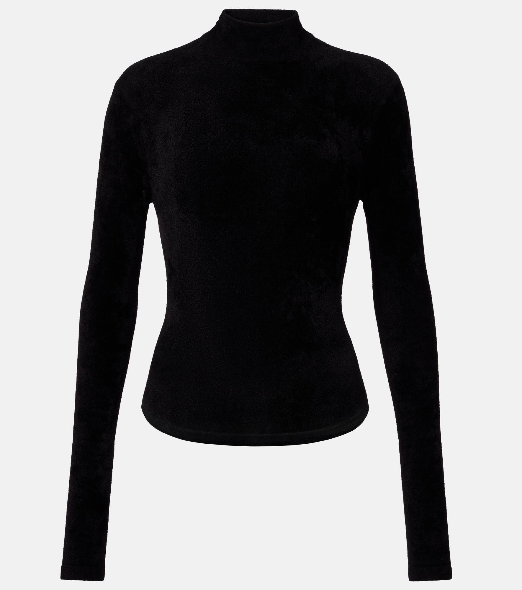 Versace brings a sleek, sophisticated edge to this turtleneck bodysuit. Crafted from stretch-infused chenille, it’s designed for a close, sculpting fit — serving as a refined foundation for both day-to-night and layered looks. Product Details - Material: 63% viscose, 37% nylon - Care instructions: dry clean - Made in Italy - Designer color name: Black - Item color: black - Closure: hook fastening - Collar: turtleneck - Item number: P01080590 Size & Fit - True to size - Fitted - Stretchy fabric - Falls to the hip - Height of model is 180cm-71" and wears a size IT 40