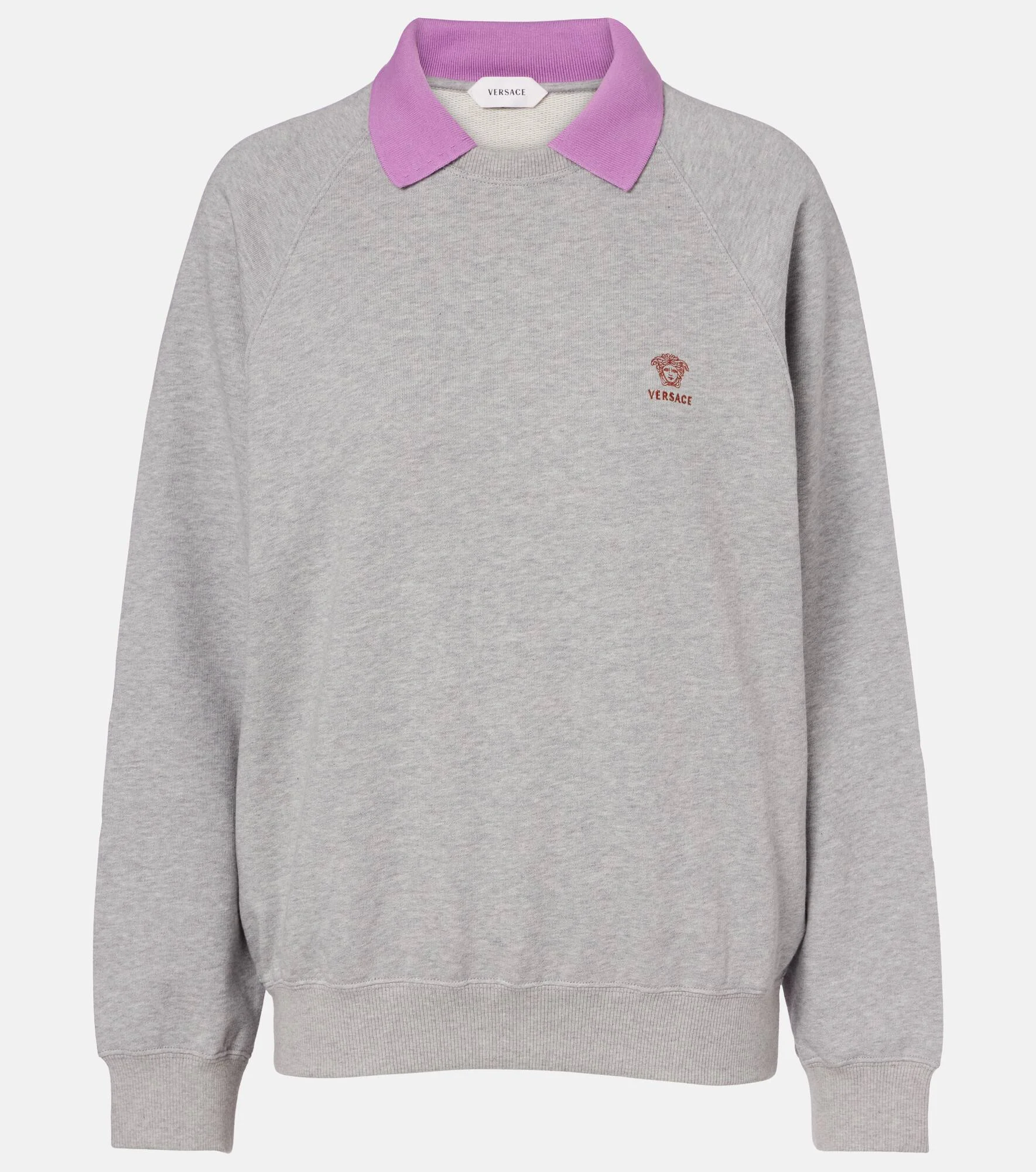 Add this sweatshirt from Versace to your everyday rotation. Made from soft cotton jersey, the style is complete with an embroidered logo and a contrasting pointed collar for a polished finish. Product Details - Material: 100% cotton - Care instructions: machine wash at 30 degrees - Made in Italy - Color: grey - Designer color name: Grigio Melange+Violet - Embroidery: 100% polyester - Trim: 98% cotton, 2% elastane - Hem: ribbed - Cuff: ribbed - Collar: polo collar - Item number: P01152890 Size & Fit - True to size - Designed for a loose fit - Slightly stretchy fabric - Falls below the hip - The model seen in the picture is 178cm-5'10" and wearing a size IT 40