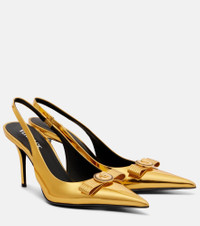 Inspired by Greek mythology, the Medusa head has become the ultimate signifier of the house of Versace. It adorns the vamps of these elegant mirrored leather slingback pumps, along with Gianni Ribbon details. Product Details - Upper: calf leather - Lining: leather - Sole: leather insole and sole - Toe shape: pointed toe - Made in Italy - Includes: shoe box - Designer color name: Gold-Versace Gold - Item color: gold - Slingback strap - Item number: P01055283 Size & Fit - Fits slightly large to size - we recommend trying a half size smaller - European sizes - 8,5cm-3.5" heel (size EU 38)