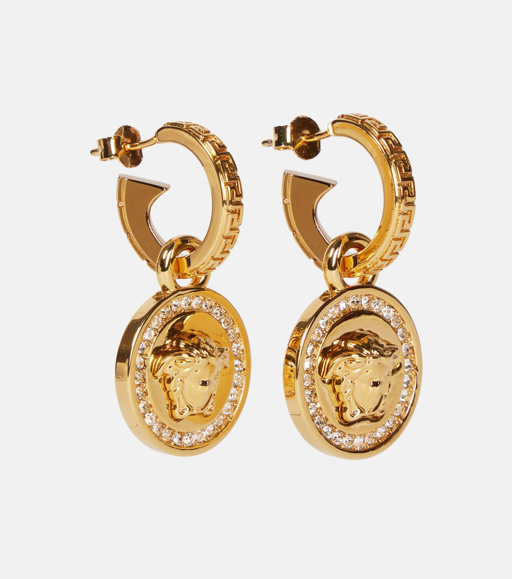 The Versace woman is known for her more-is-more aesthetic, opting for a statement look with opulent character. These drop earrings come in glossy gold tone and are enhanced by a border of dazzling crystals. The label's signature Medusa head and Greca pattern add instant brand recognition – sweep back your hair to show them off. Product Details - Closure: clasp fastening - Pendant: crystals - Made in Italy - For pierced ears - Item number: P00300263 Size & Fit - Length 3,7cm-1.5" - Max. width 1,8cm-0.5"