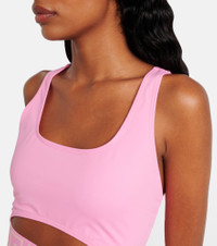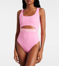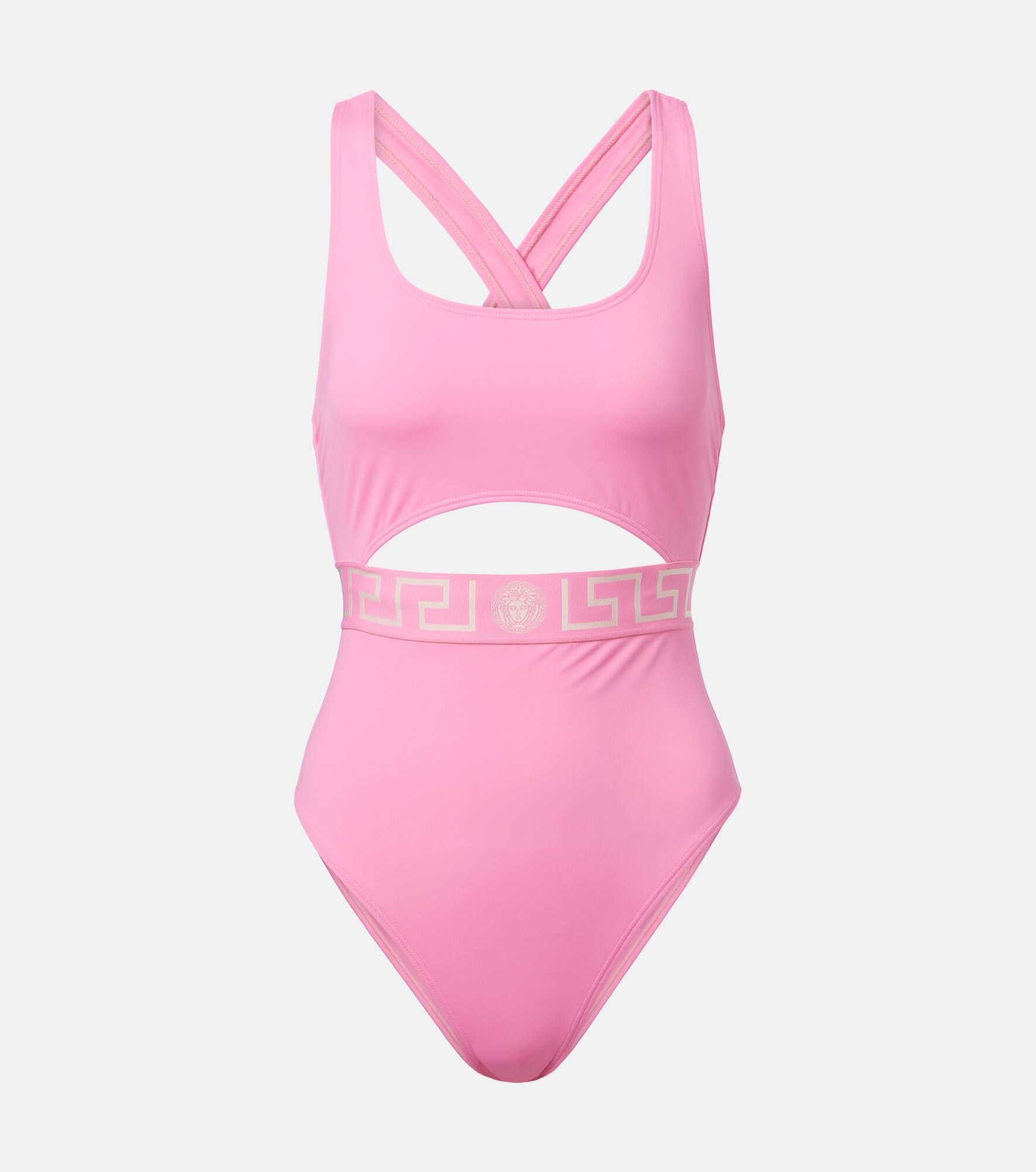 Your next getaway is glamorous with this swimsuit from Versace. The design features alluring cutouts and boasts the brand’s iconic Greca Border along the waist. Product Details - Material: 78% nylon (recycled), 22% elastane - Care instructions: hand wash - Made in Italy - Designer color name: Guava - Item color: pink - Details: 82% polyester, 9% nylon, 9% polyamide - Lining: 78% nylon, 22% elastane - Item number: P01069637 Size & Fit - True to size - Elasticated waist - Minimal coverage - High-cut leg - The model seen in the picture is 178cm-5'10" and wearing a size 1