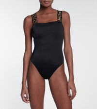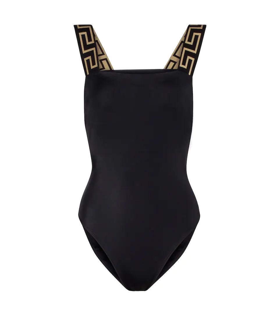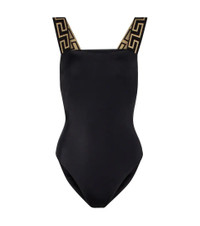 This black swimsuit from Versace is a timeless addition to your poolside edit. Made in Italy from technical jersey, it's defined by elasticated Greca border shoudler straps, a square neckline and a low-cut back. Complement yours with gold-tone jewelry when not in the water. Product Details - Made in Italy - Lining: 22% elastane, fully lined, 78% polyamide - Trim: 9% polyamide, 9% elastane, 82% polyester - Designer color name: Nero - Care instructions: hand wash - Material: 78% polyamide, 22% elastane - Item number: P00533118 Size & Fit - Fits small to size - we recommend trying one size larger - Petite sizing - High-cut leg - The model seen in the picture is 178cm-5'10", cup size B, and wearing a size 2