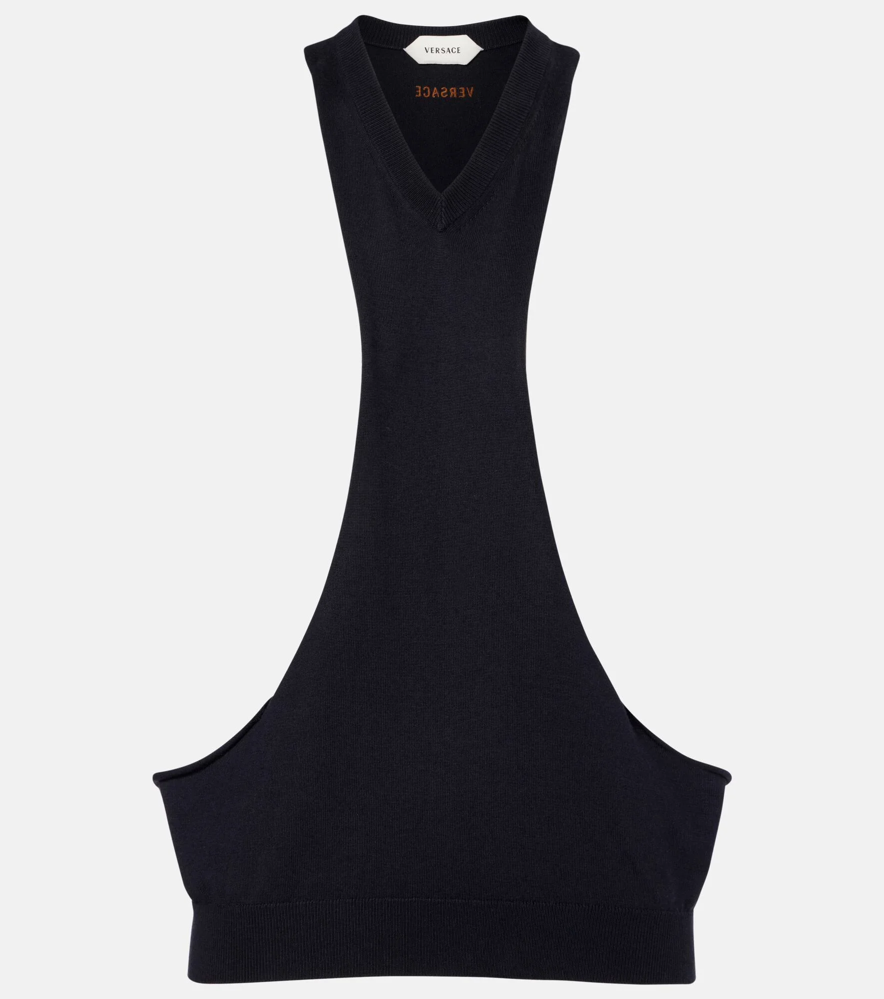 This daring top from Versace features exaggerated arm holes for intrigue and shape. Made in Italy, the piece is knitted from pure cotton yarn to a V-neck silhouette. Product Details - Material: 100% cotton - Care instructions: dry clean - Made in Italy - Color: blue - Designer color name: Navy - Embroidery: 100% polyester - Trim: 85% cotton, 10% nylon, 5% elastane - Collar: V-neck - Hem: ribbed - Item number: P01152862 Size & Fit - True to size - Designed for a loose fit - Elasticated hem - Slightly stretchy fabric - Falls to the hip - Height of model is 174cm-68.5" and wears a size IT 40